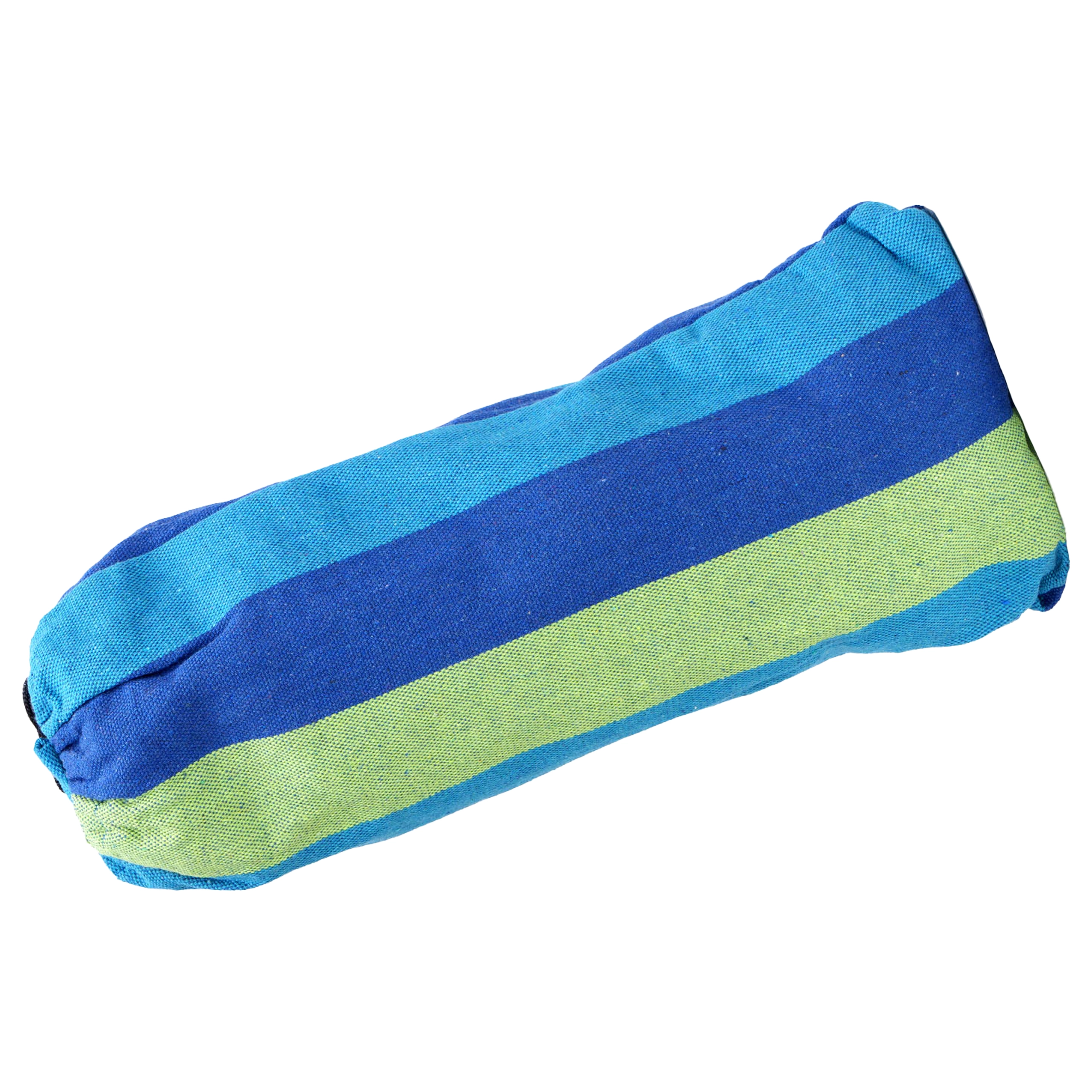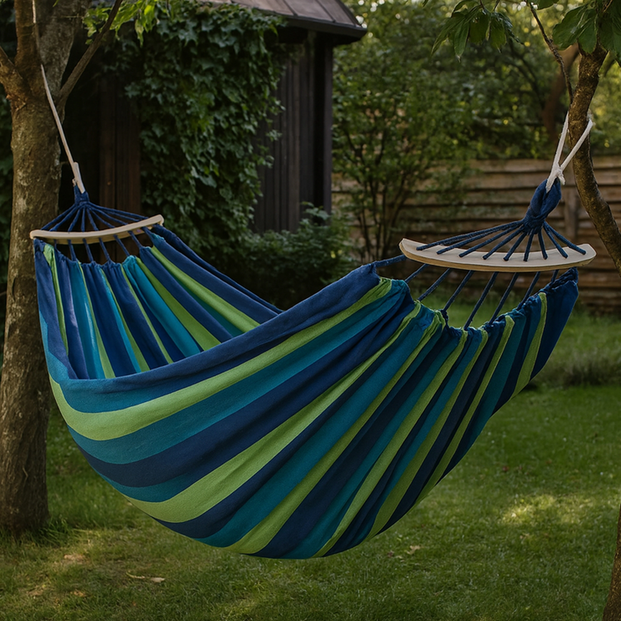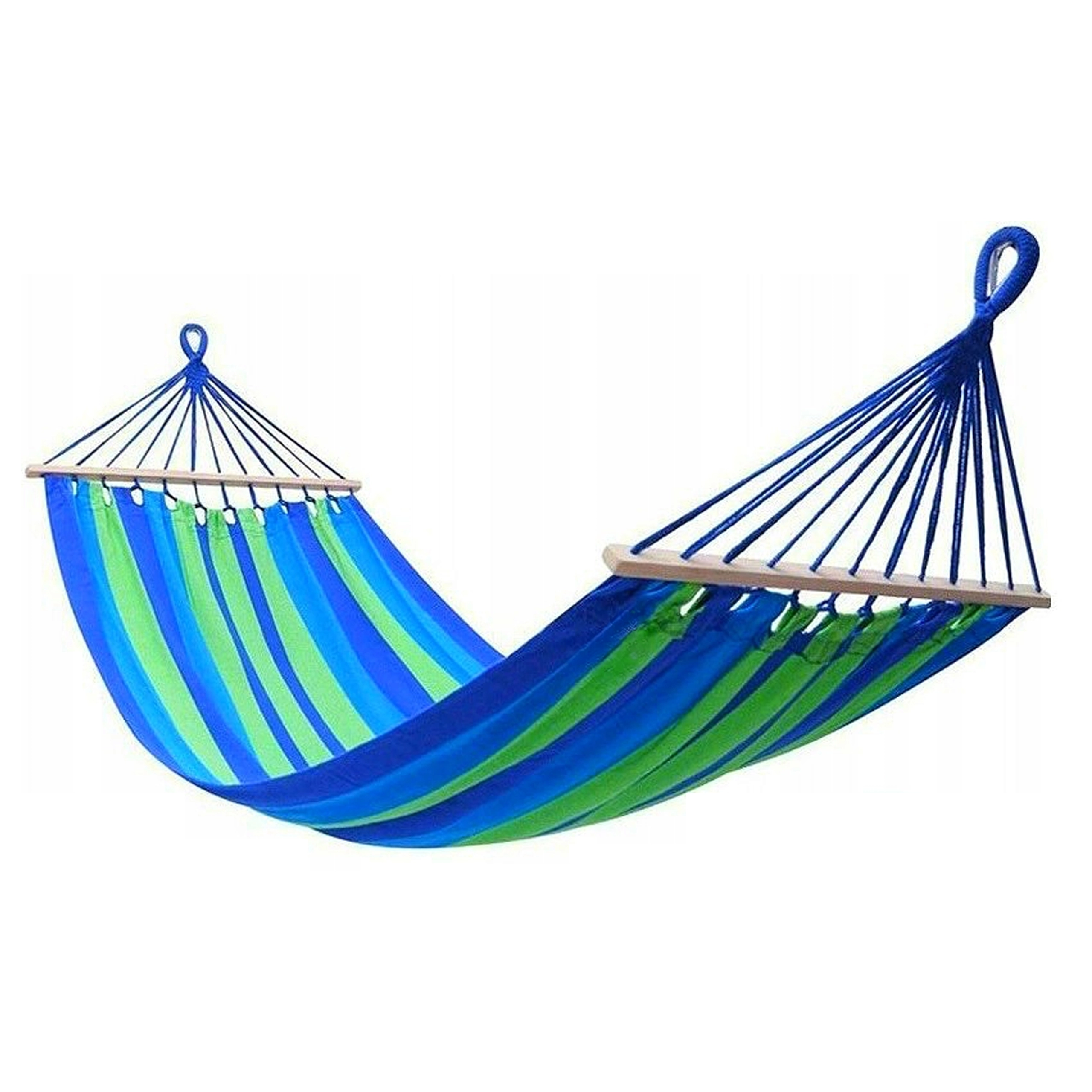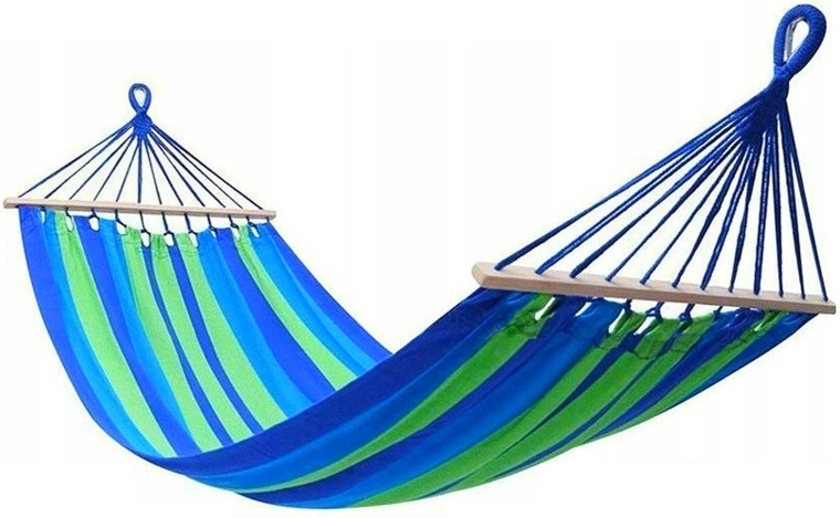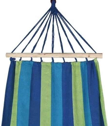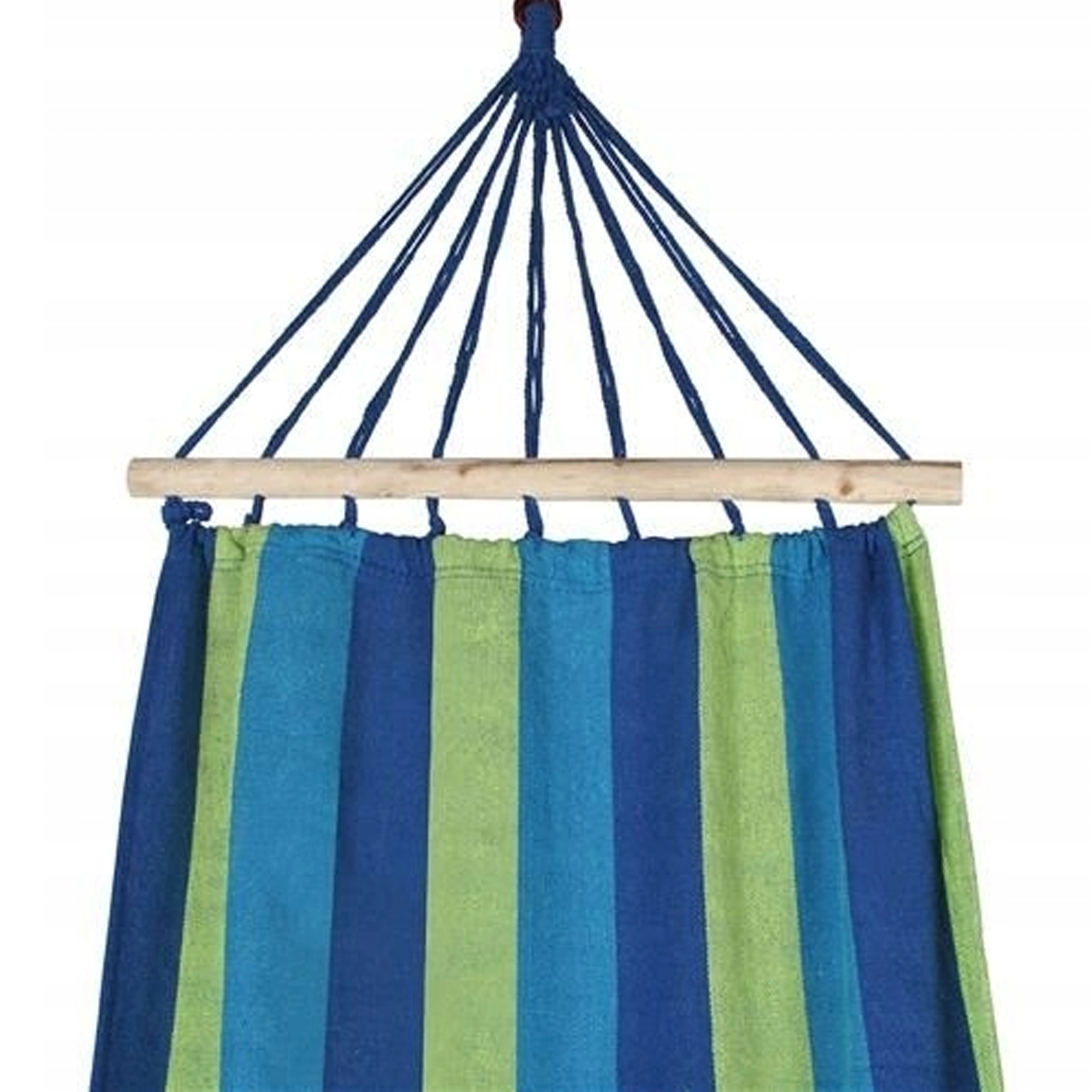 Táto dvojmiestna hojdacia sieť v pruhovanom modro‑zelenom dizajne je ideálna na záhradu, terasu, kempovanie aj výlety k vode. Široké lôžkové plátno je príjemné na dotyk a drevené rozperné tyče udržiavajú plochu otvorenú pre pohodlné nastupovanie a stabilnú polohu pri ležaní.