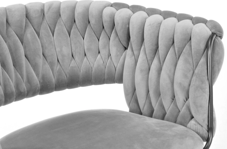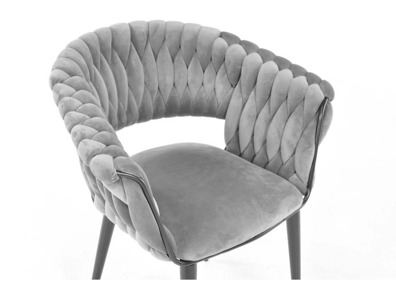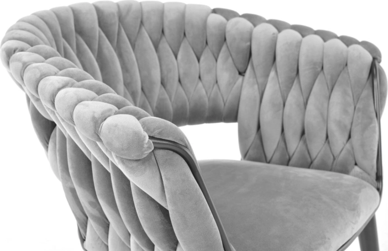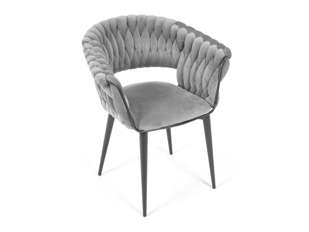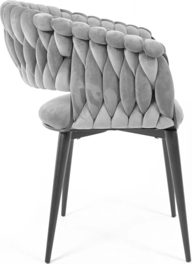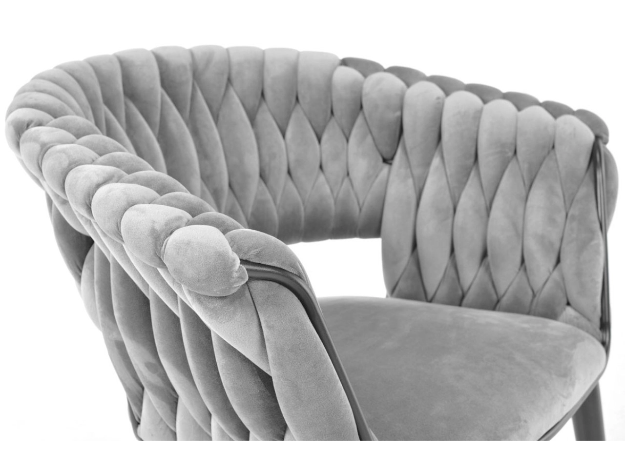 Elegantné sivé kreslo z mäkkého „velvet“ zamatu s výrazným pleteným operadlom a čiernymi kovovými nohami dodá interiéru moderný glamour nádych. Ponúka pohodlné polstrovanie, stabilnú konštrukciu a štýlový kontrast sivej a čiernej, ktorý sa hodí do jedálne, obývačky aj pracovne.