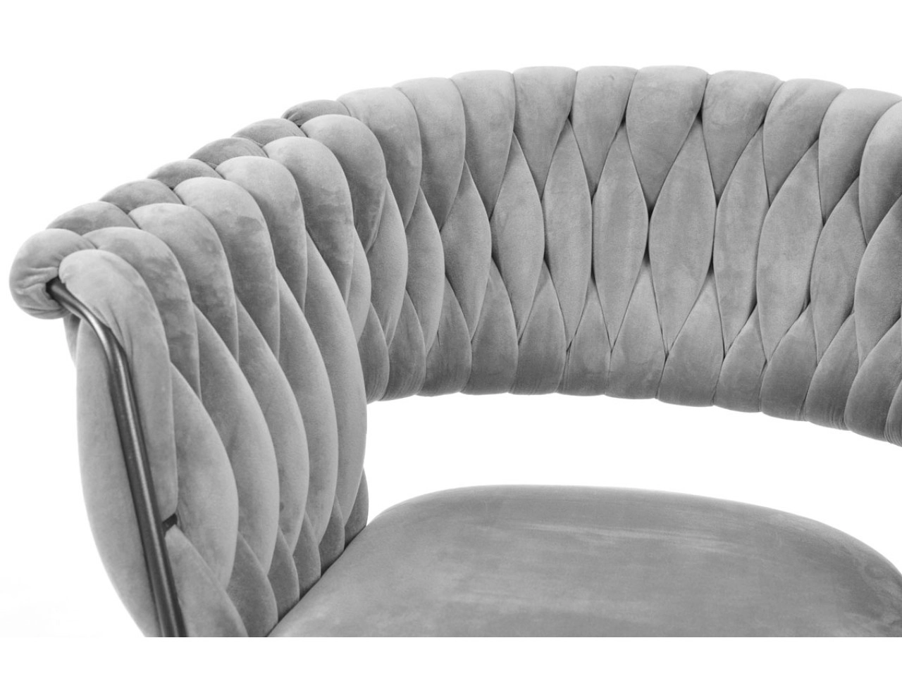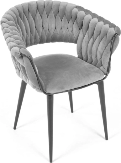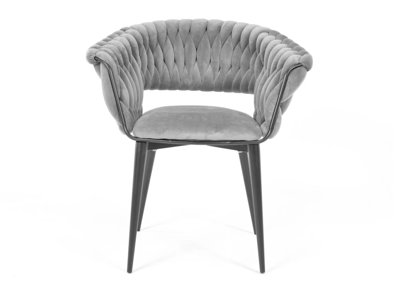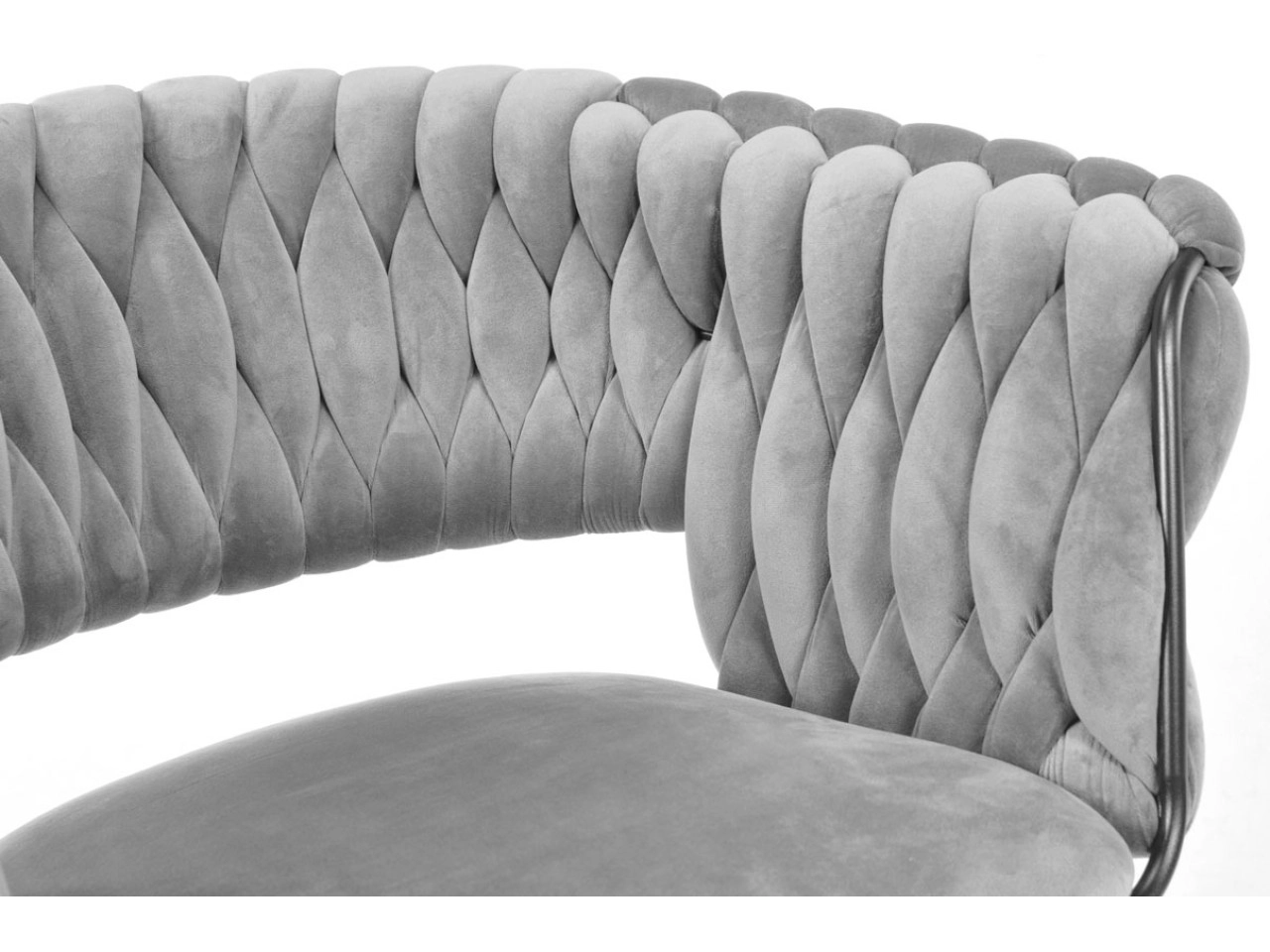 Elegantné sivé kreslo z mäkkého „velvet“ zamatu s výrazným pleteným operadlom a čiernymi kovovými nohami dodá interiéru moderný glamour nádych. Ponúka pohodlné polstrovanie, stabilnú konštrukciu a štýlový kontrast sivej a čiernej, ktorý sa hodí do jedálne, obývačky aj pracovne.