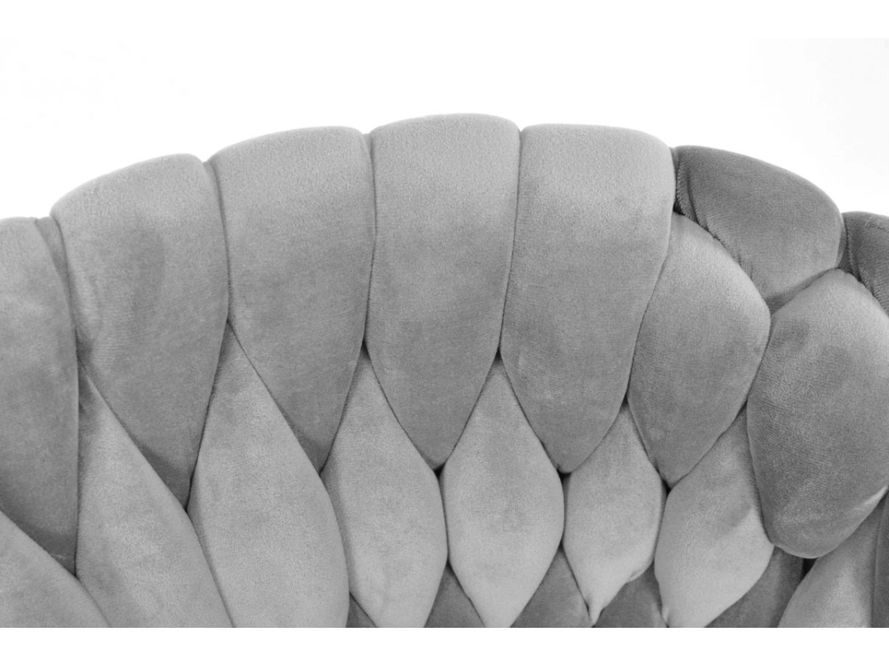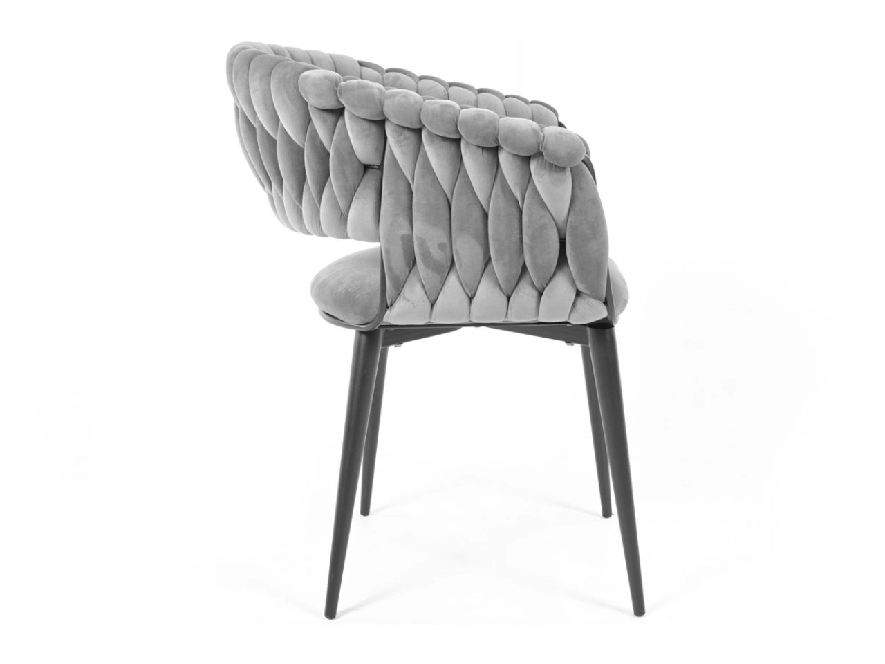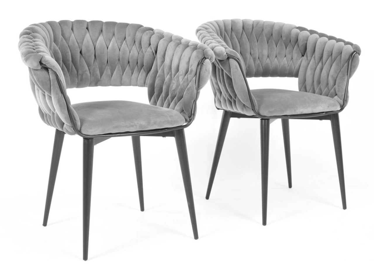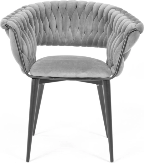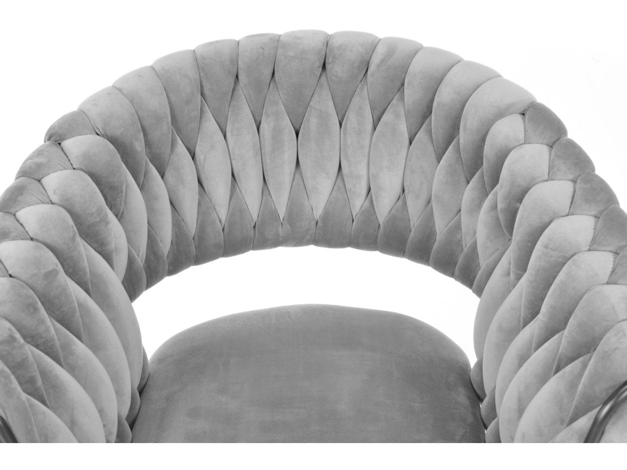 Elegantné sivé kreslo z mäkkého „velvet“ zamatu s výrazným pleteným operadlom a čiernymi kovovými nohami dodá interiéru moderný glamour nádych. Ponúka pohodlné polstrovanie, stabilnú konštrukciu a štýlový kontrast sivej a čiernej, ktorý sa hodí do jedálne, obývačky aj pracovne.