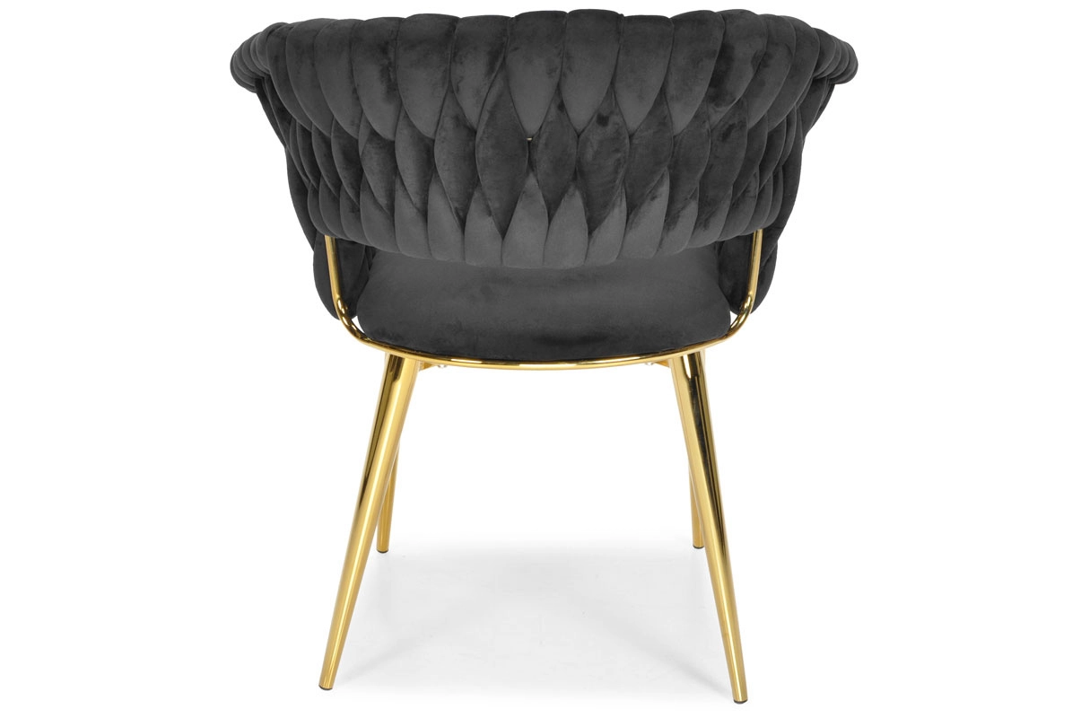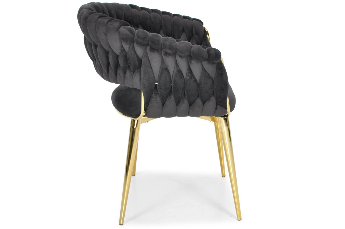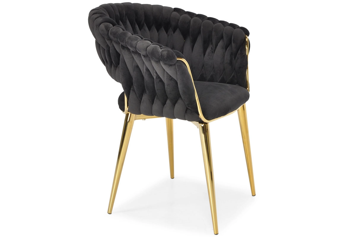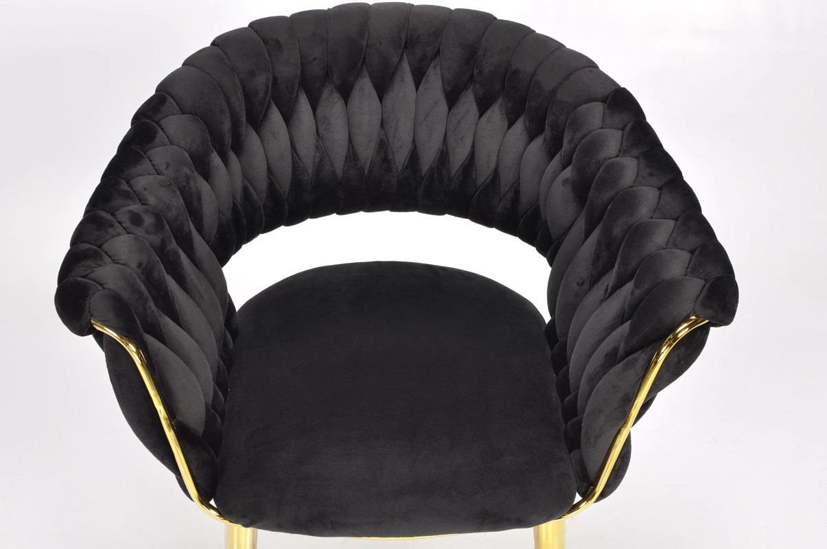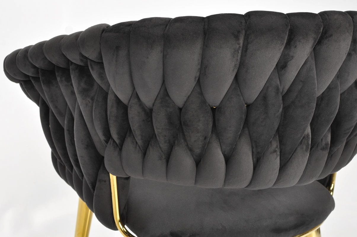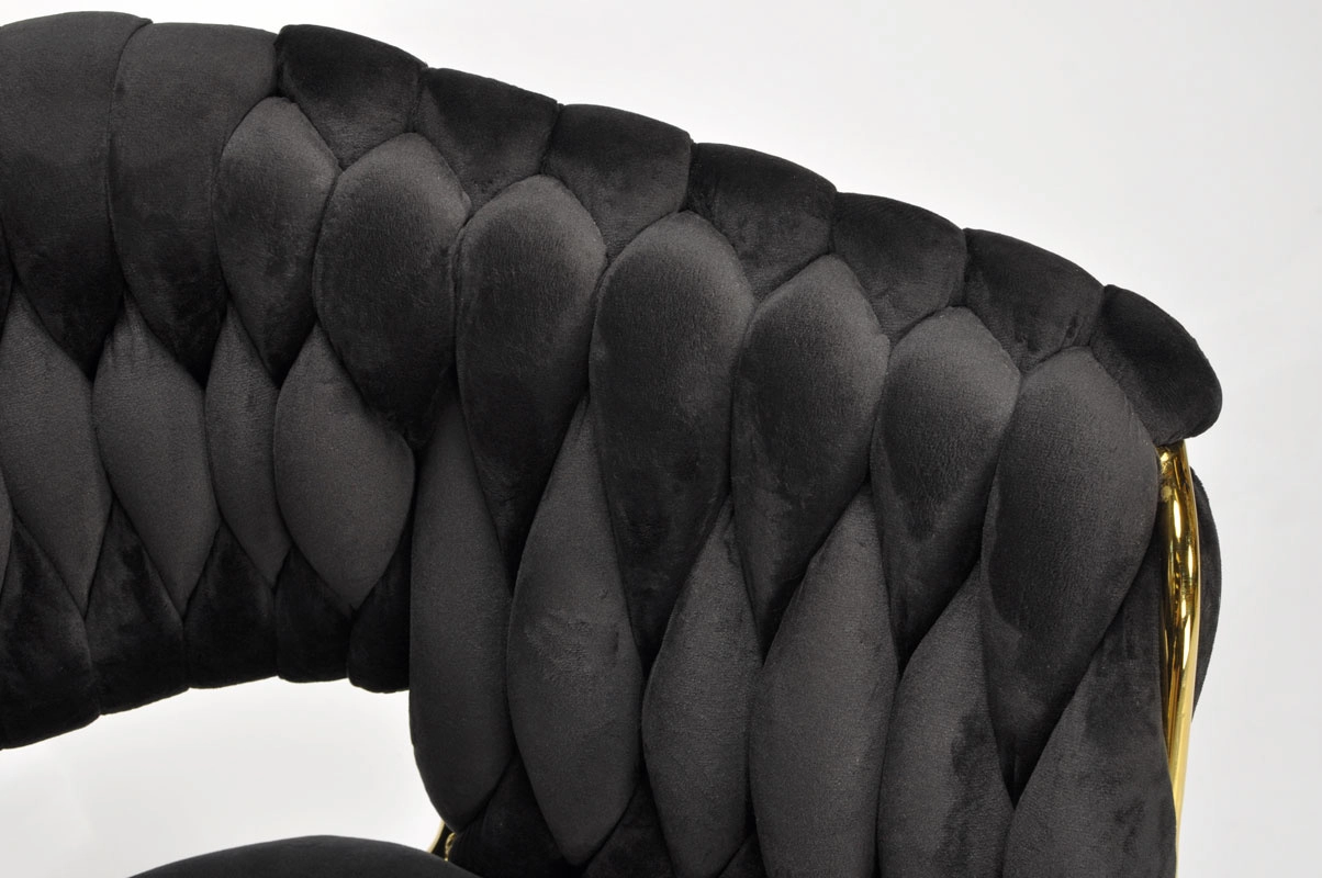 Táto moderná zamatová stolička kombinuje nadčasovú čiernu a zlaté akcenty pre maximálny efekt. Velúrové čalúnenie je hebké na dotyk a jemne sa leskne, takže skvelo vynikne v jedálni, obývačke aj v štýlovej kaviarni. Pletené operadlo dodáva stoličke dekoratívny charakter a robí z nej pôsobivý solitér.