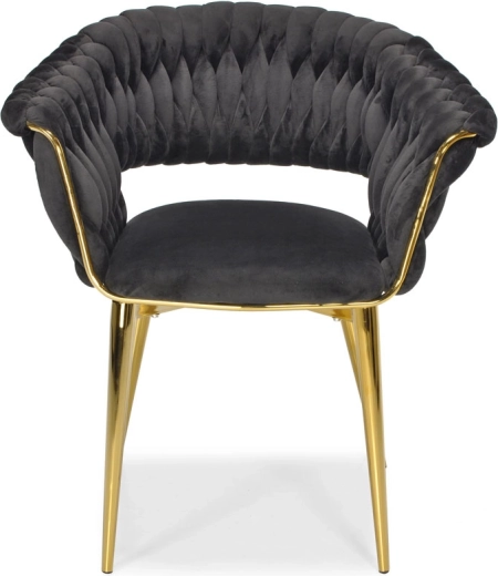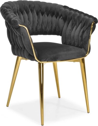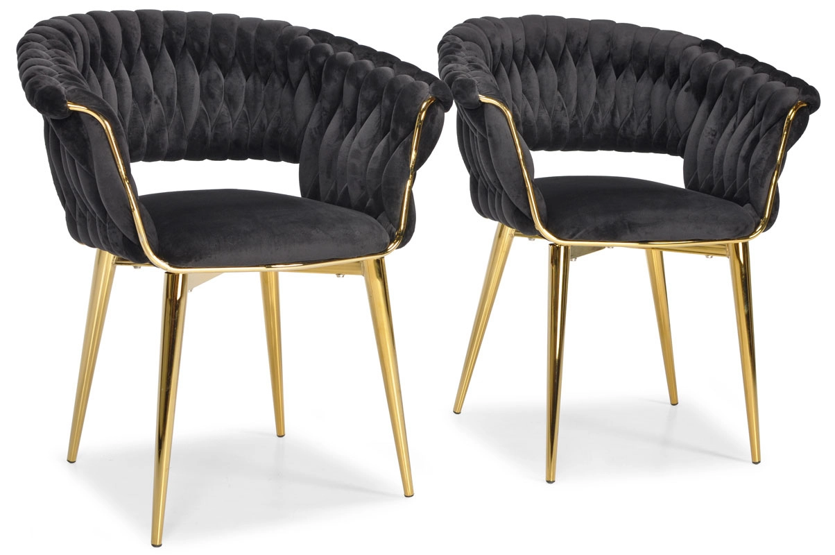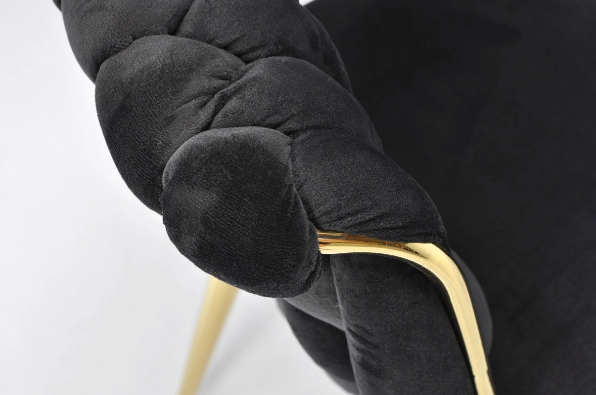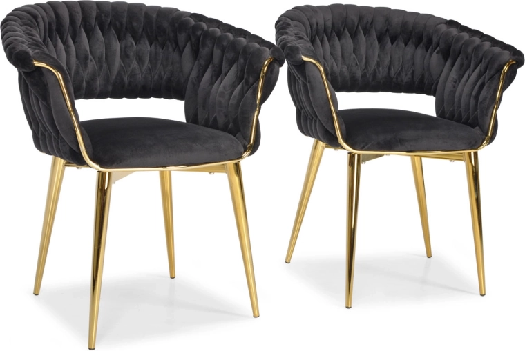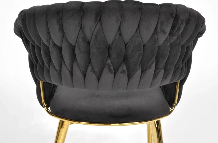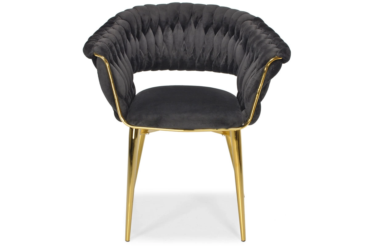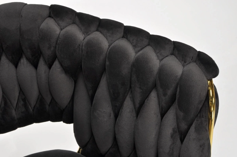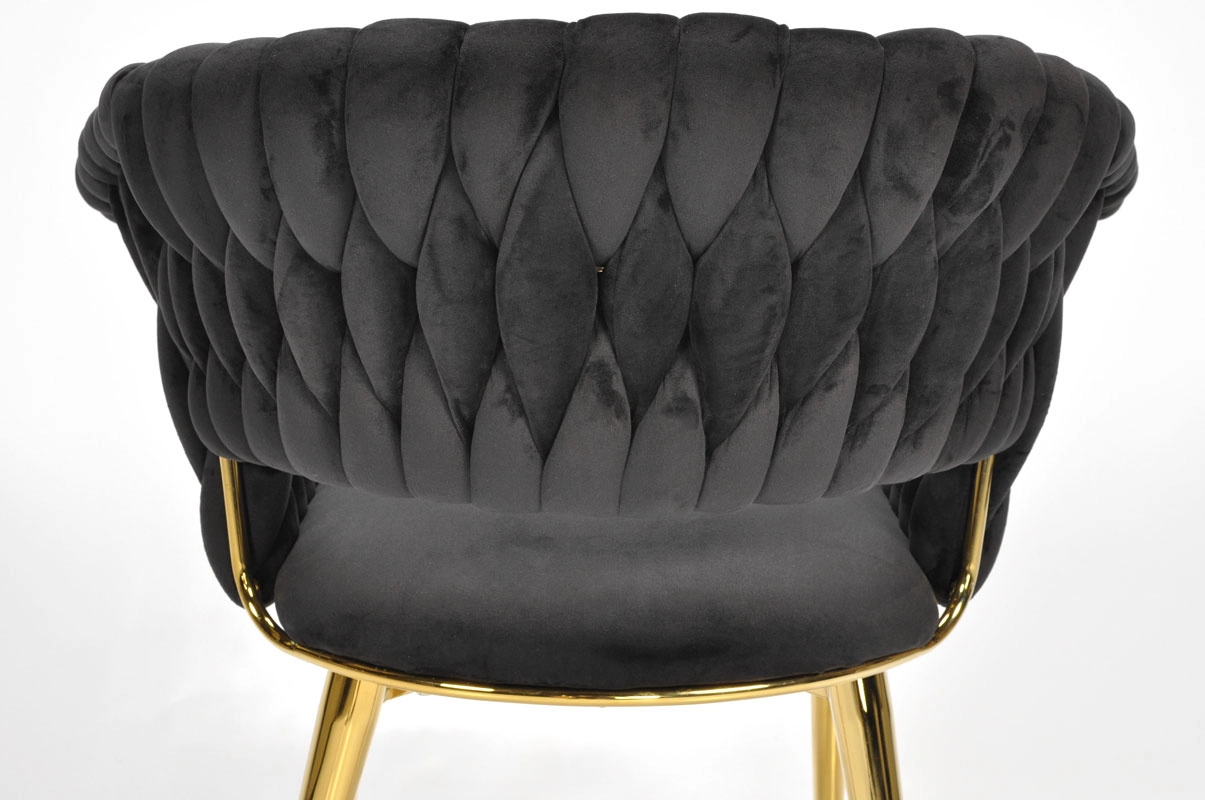 Táto moderná zamatová stolička kombinuje nadčasovú čiernu a zlaté akcenty pre maximálny efekt. Velúrové čalúnenie je hebké na dotyk a jemne sa leskne, takže skvelo vynikne v jedálni, obývačke aj v štýlovej kaviarni. Pletené operadlo dodáva stoličke dekoratívny charakter a robí z nej pôsobivý solitér.