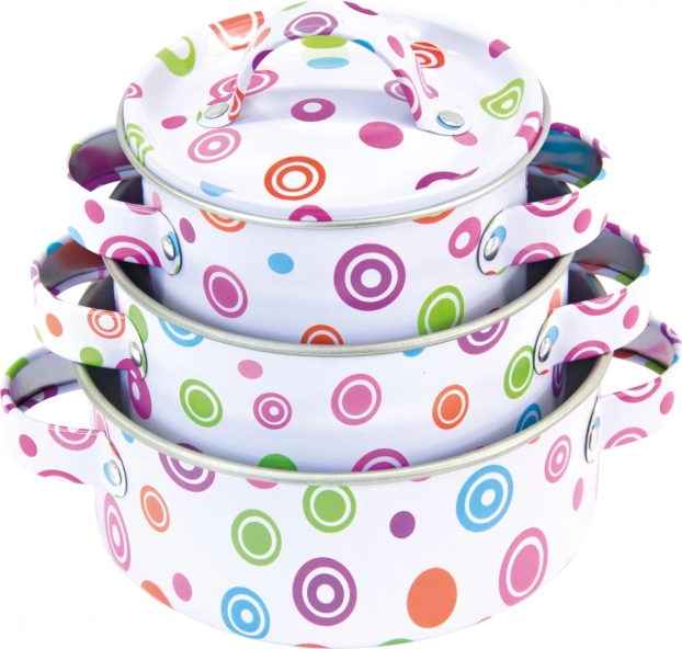Táto kvalitná sada smaltovaného riadu pre deti je ideálna na hru na kuchárov a malé gazdinky. Kovové hrnce, panvica aj náradie pôsobia autenticky, takže si deti užijú realistické varenie a servírovanie. Farebné bodky na bielom podklade dodávajú celej sade veselý vzhľad, ktorý oživí každý detský kútik.