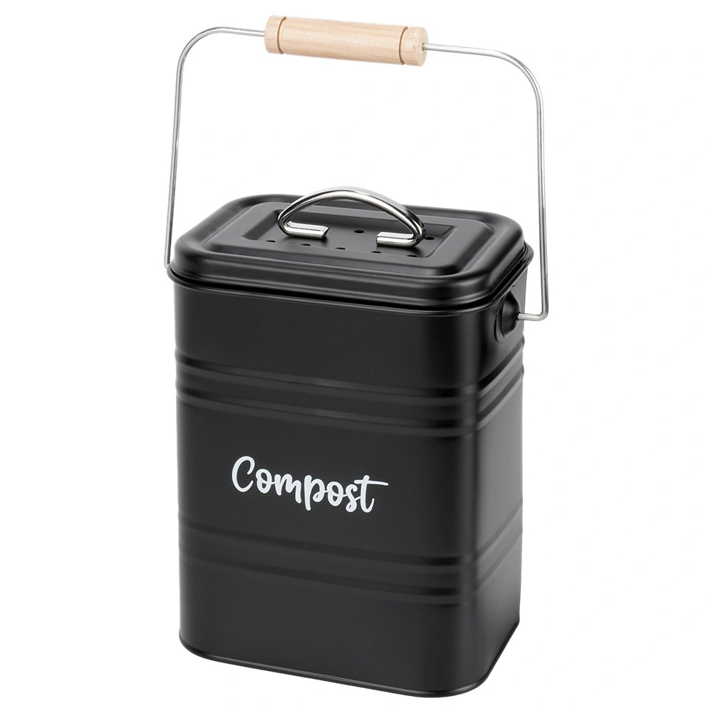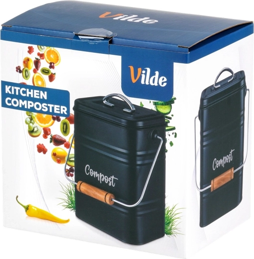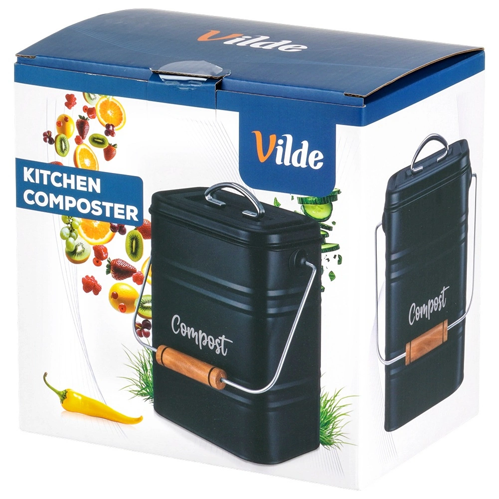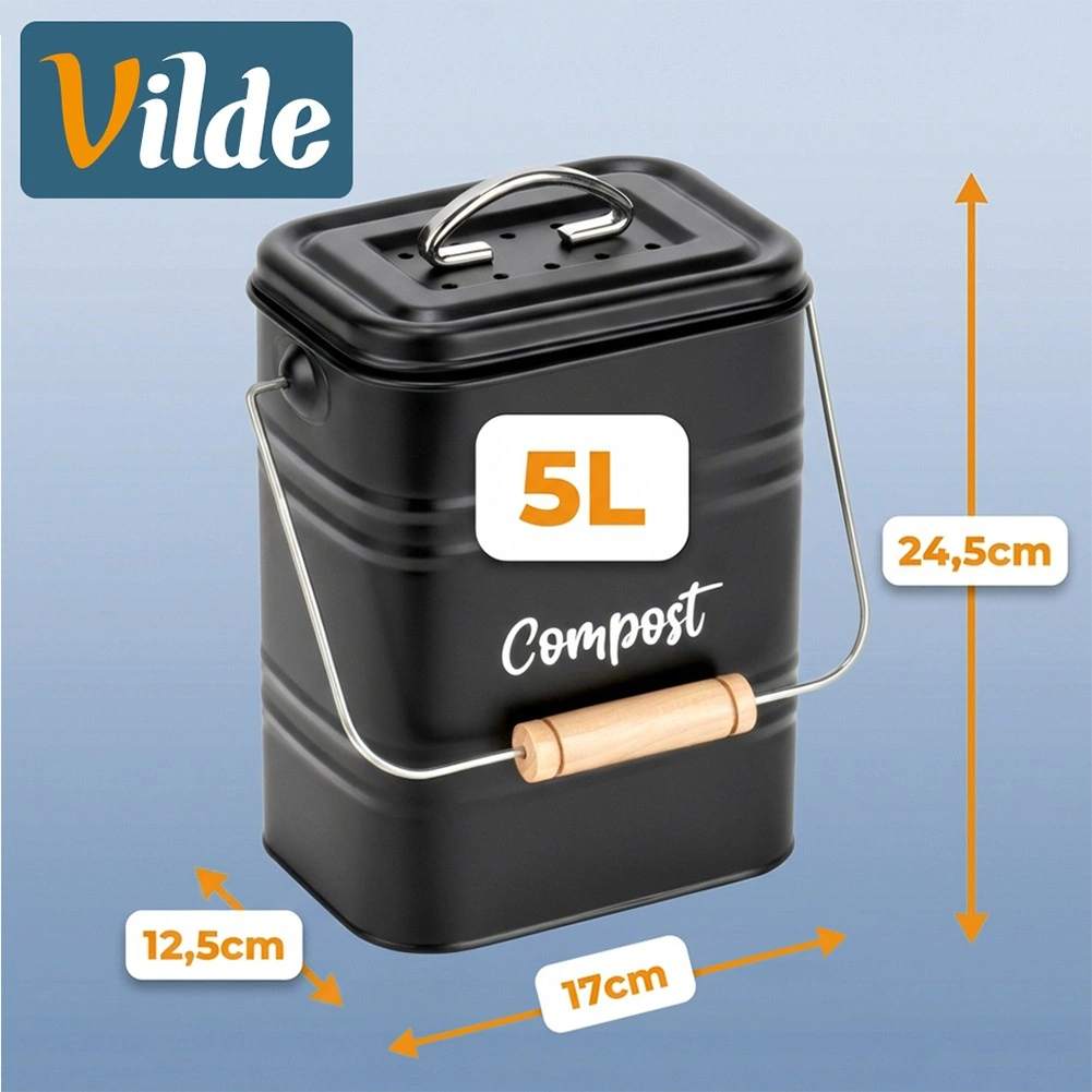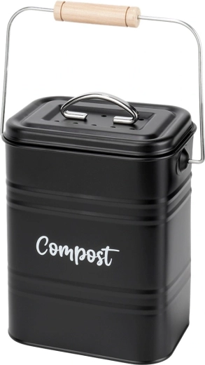 Robustná kovová konštrukcia v elegantnej čiernej farbe s nápisom „Compost“ je odolná voči každodennému používaniu. Odnímateľné veko s vetracími otvormi obmedzuje prístup hmyzu a pohodlné prenášacie madlo s drevenou rukoväťou uľahčuje manipuláciu.