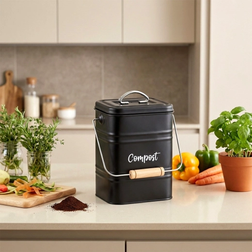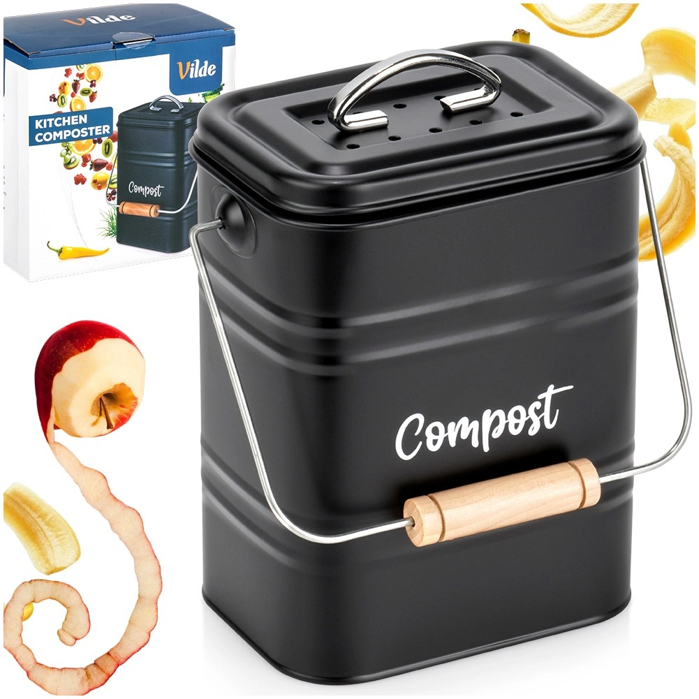 Kovový kuchynský kompostér s objemom 5 litrov je praktické riešenie na každodenné zhromažďovanie šupiek, kávovej usadeniny a ďalších organických zvyškov. Veko s vymeniteľným uhlíkovým filtrom zabezpečuje účinnú neutralizáciu pachov, takže nádobu môžete bez obáv používať aj v interiéri.