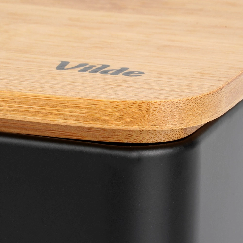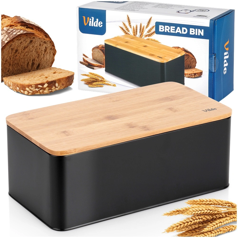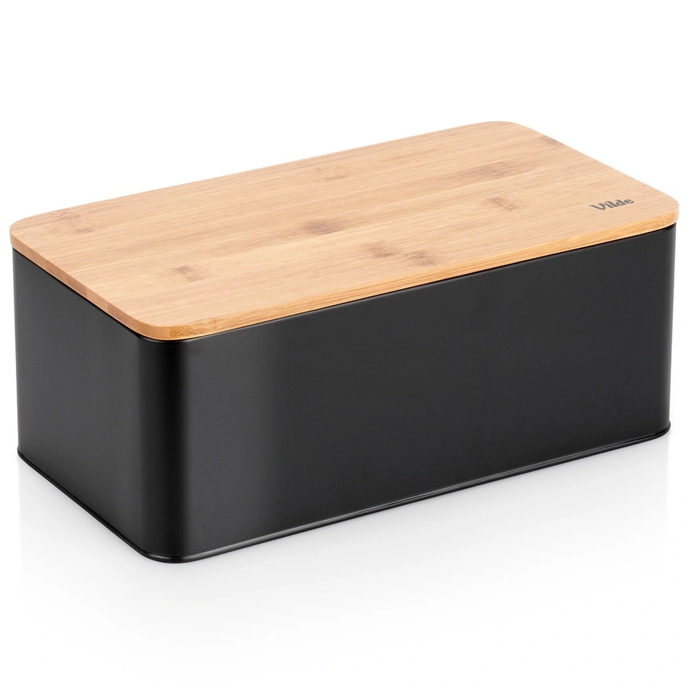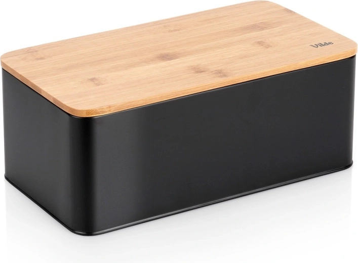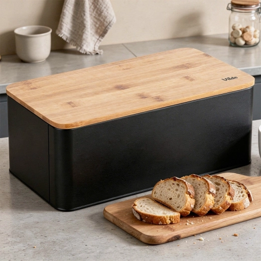 Priestranný chlebník v modernom čiernom prevedení kombinuje odolné kovové telo s prírodným bambusovým vekom, ktoré zároveň slúži ako doska na krájanie. Rozmery 33 × 18 × 13 cm poskytujú dosť miesta pre chlieb, bagety aj žemle, zatiaľ čo pevná konštrukcia chráni pečivo pred pomačkaním.