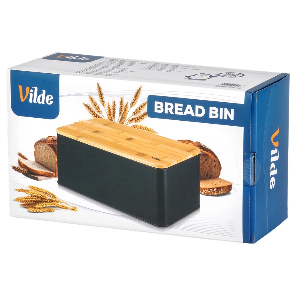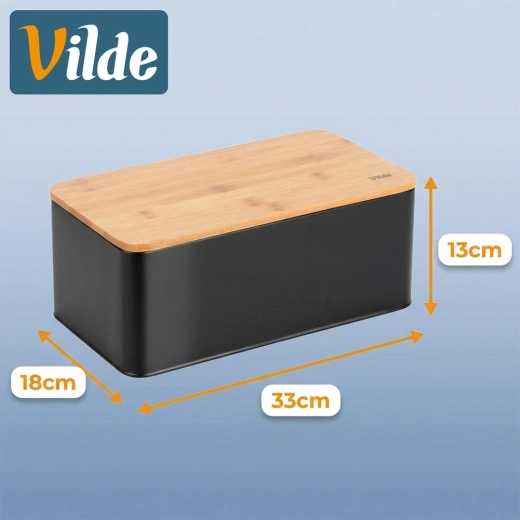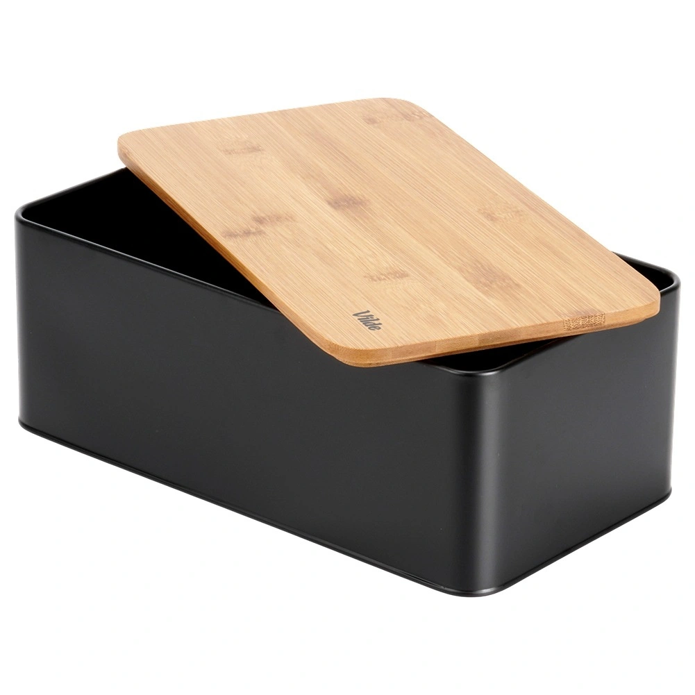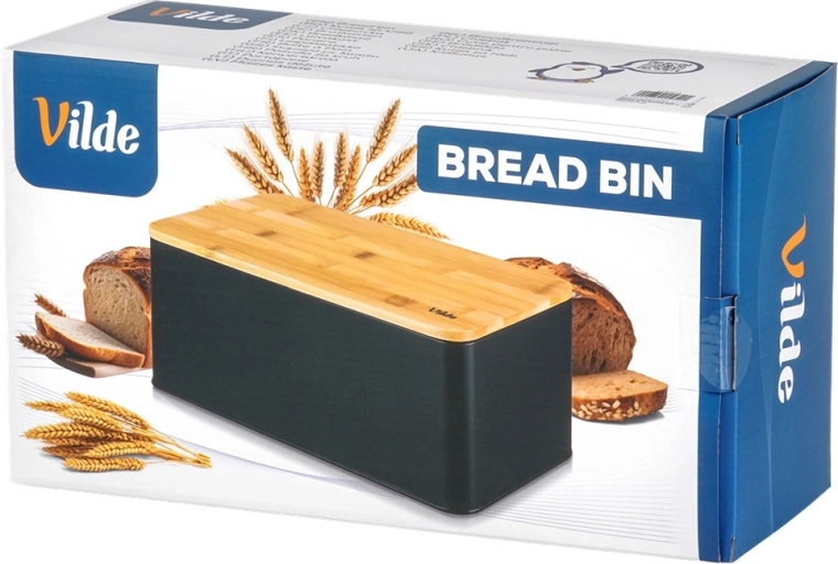 Priestranný chlebník v modernom čiernom prevedení kombinuje odolné kovové telo s prírodným bambusovým vekom, ktoré zároveň slúži ako doska na krájanie. Rozmery 33 × 18 × 13 cm poskytujú dosť miesta pre chlieb, bagety aj žemle, zatiaľ čo pevná konštrukcia chráni pečivo pred pomačkaním.