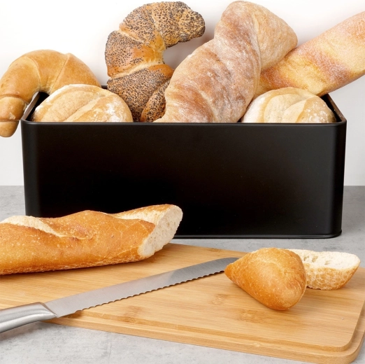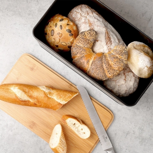 Telo z matného kovu a presne dosadajúce veko obmedzujú prístup vzduchu a bránia vysychaniu pečiva.
