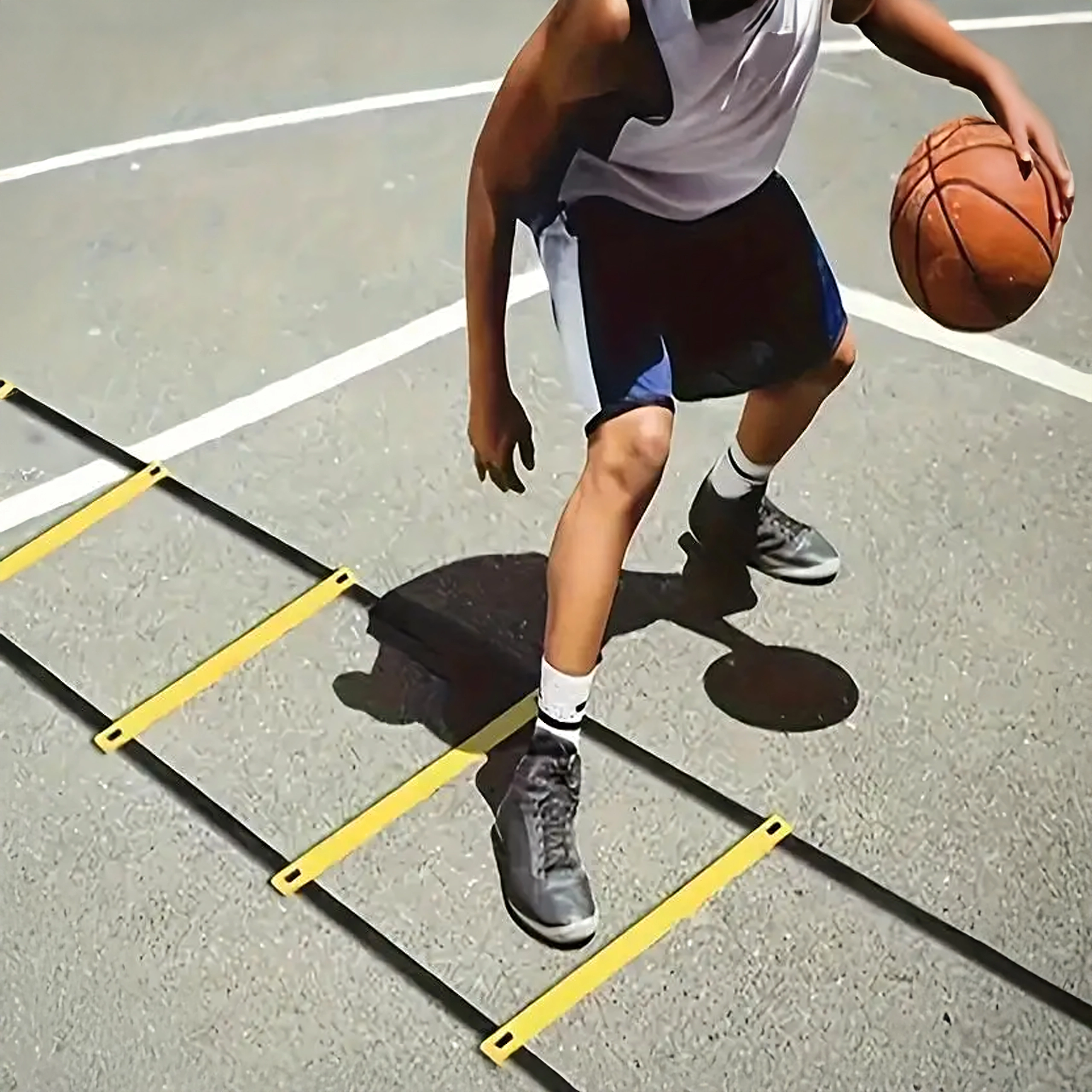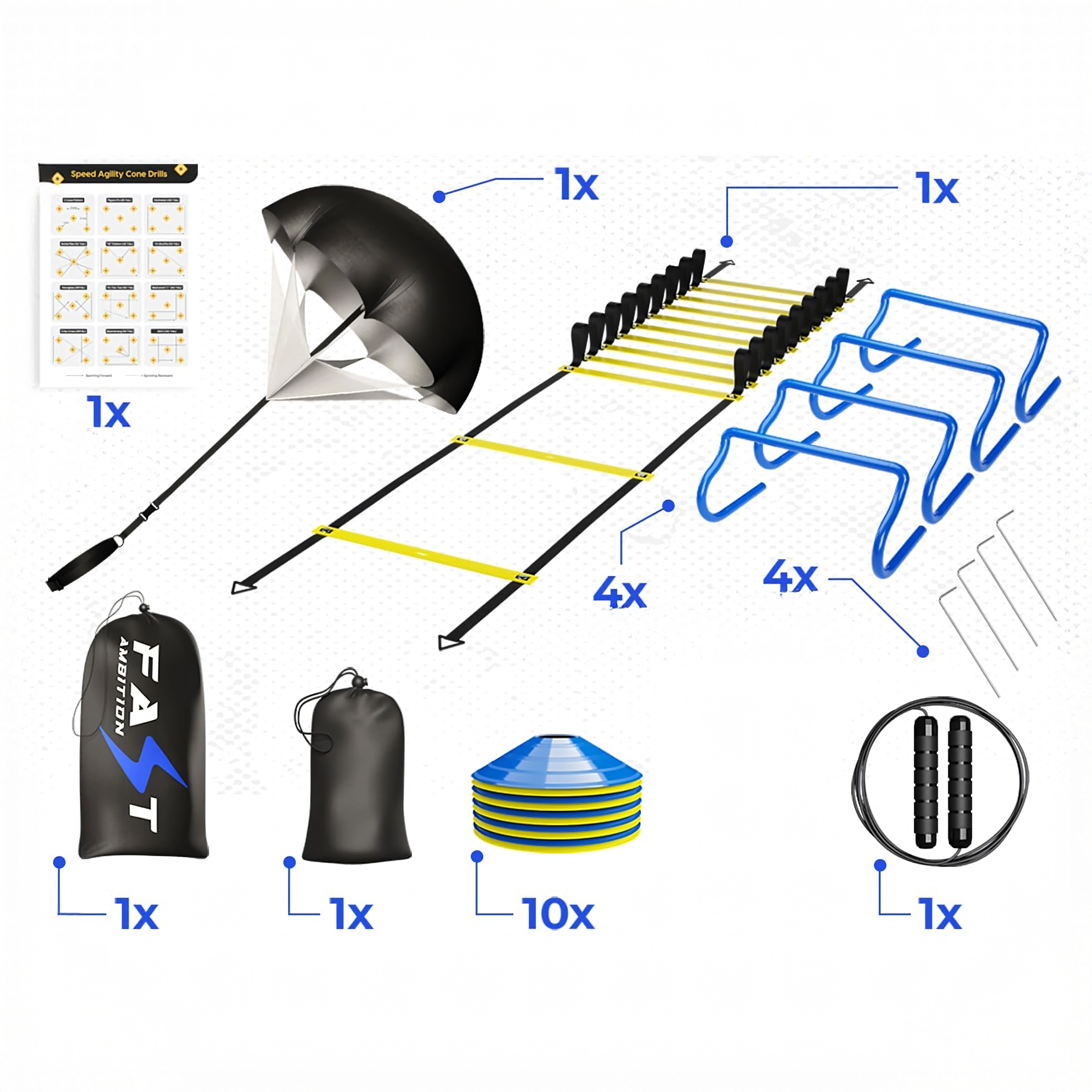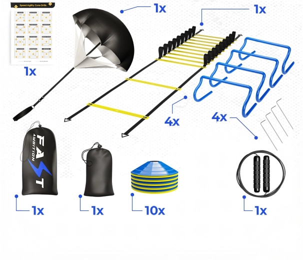 Koordinačný rebrík s nastaviteľnými plochými priečkami zlepšuje techniku kroku a stabilitu členkov. Nízko-profilové kužele a mini prekážky zvyšujú intenzitu drilov bez zbytočného rizika zakopnutia. Odporový padák pridá variabilnú záťaž pre silovo-rýchlostné behy a švihadlo doplní kardio časť tréningu.
