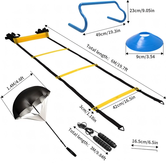 Kompletná tréningová sada pre rýchlosť, obratnosť a koordináciu zahŕňa koordinačný rebrík, mini prekážky, značkovacie kužele, švihadlo, kotviace kolíky a odporový padák. Ideálna na futbal, atletiku aj domáci kondičný tréning. Vďaka nastaviteľným priečkam, odolnému prevedeniu a praktickým obalom je set ľahko prenosný a pripravený na intenzívne drily kdekoľvek.
