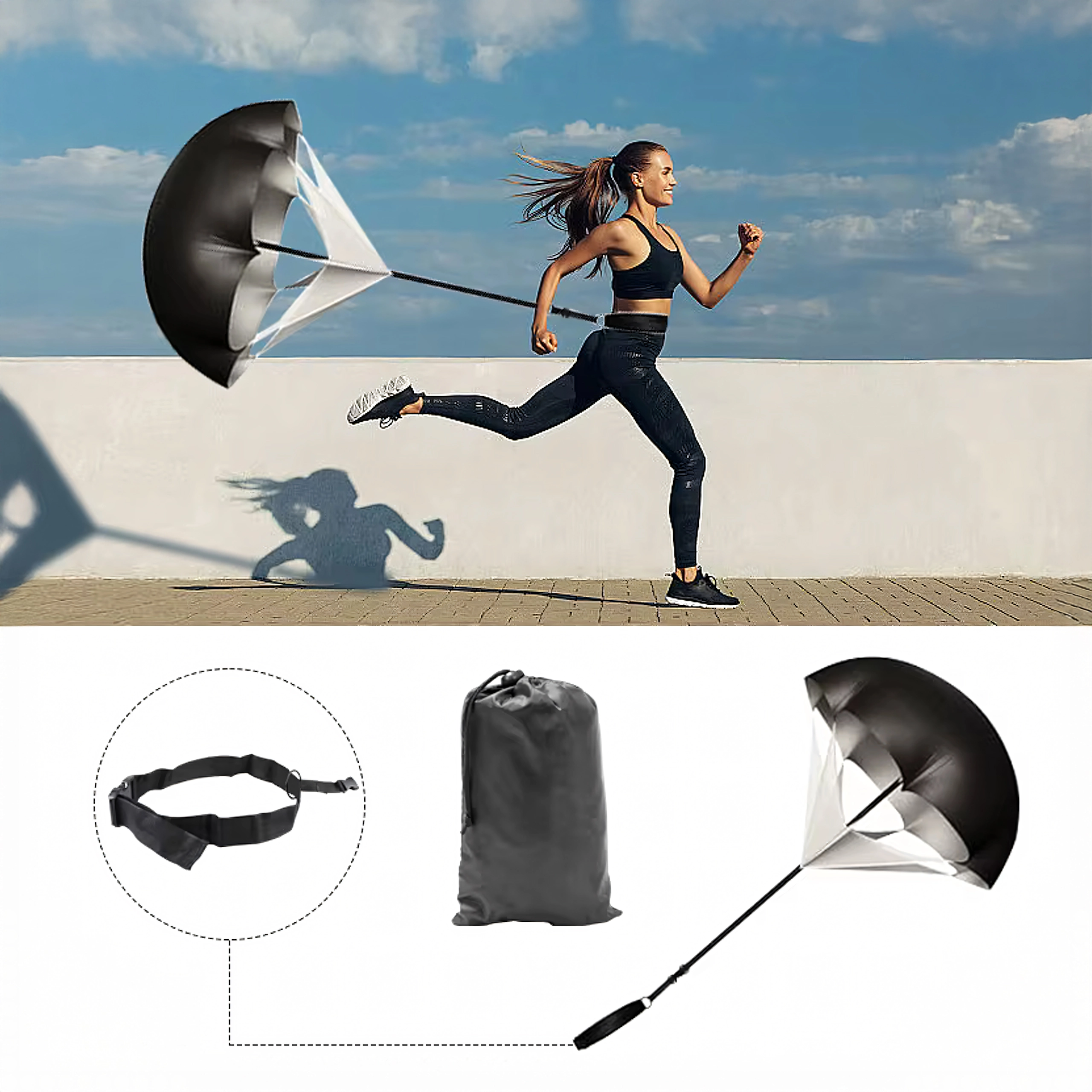 Ľahká padáková záťaž zvyšuje odpor pri šprinte a pomáha rozvíjať akceleráciu aj maximálnu rýchlosť. Nastaviteľný pás drží pevne na mieste a padák sa ľahko zloží do priloženého vaku.
