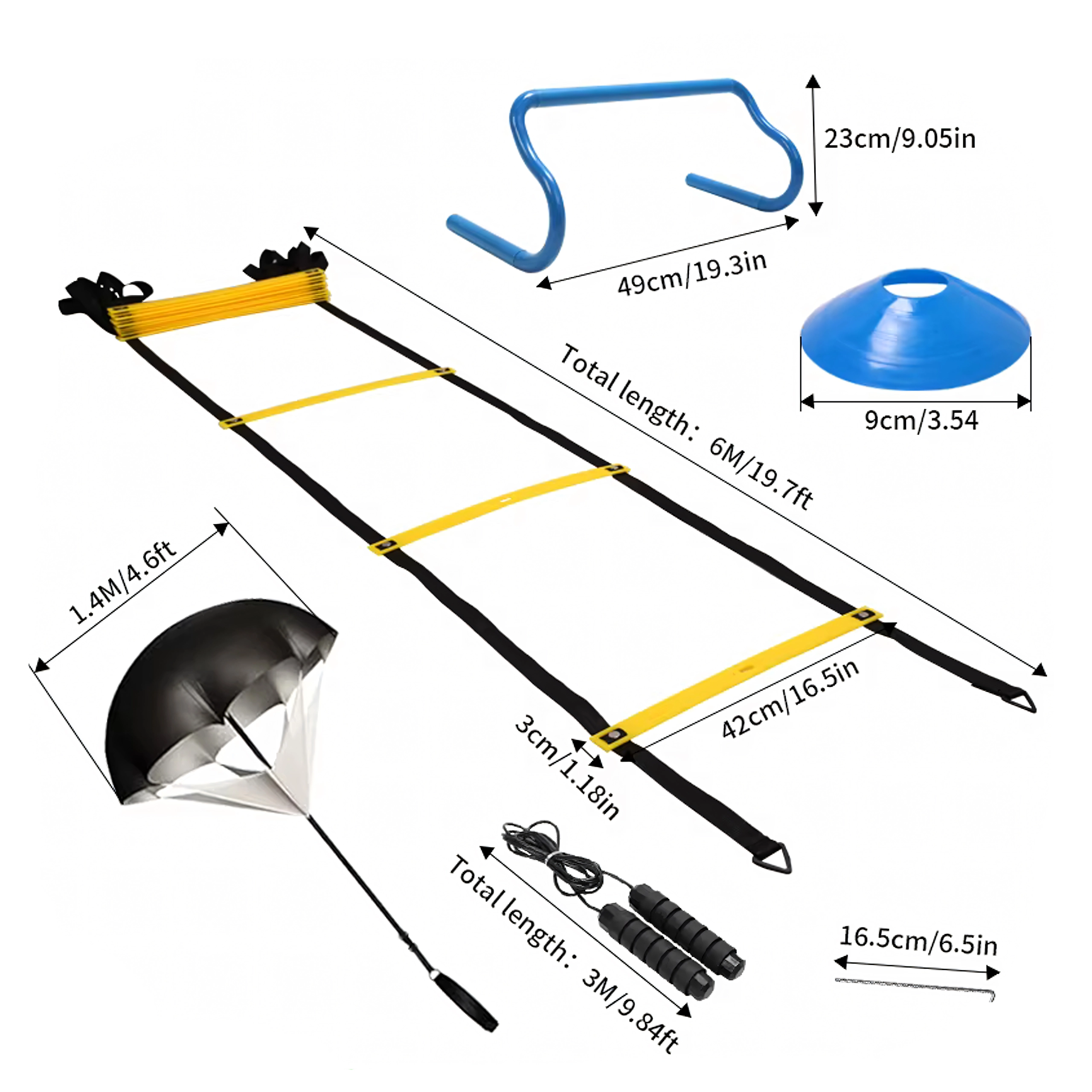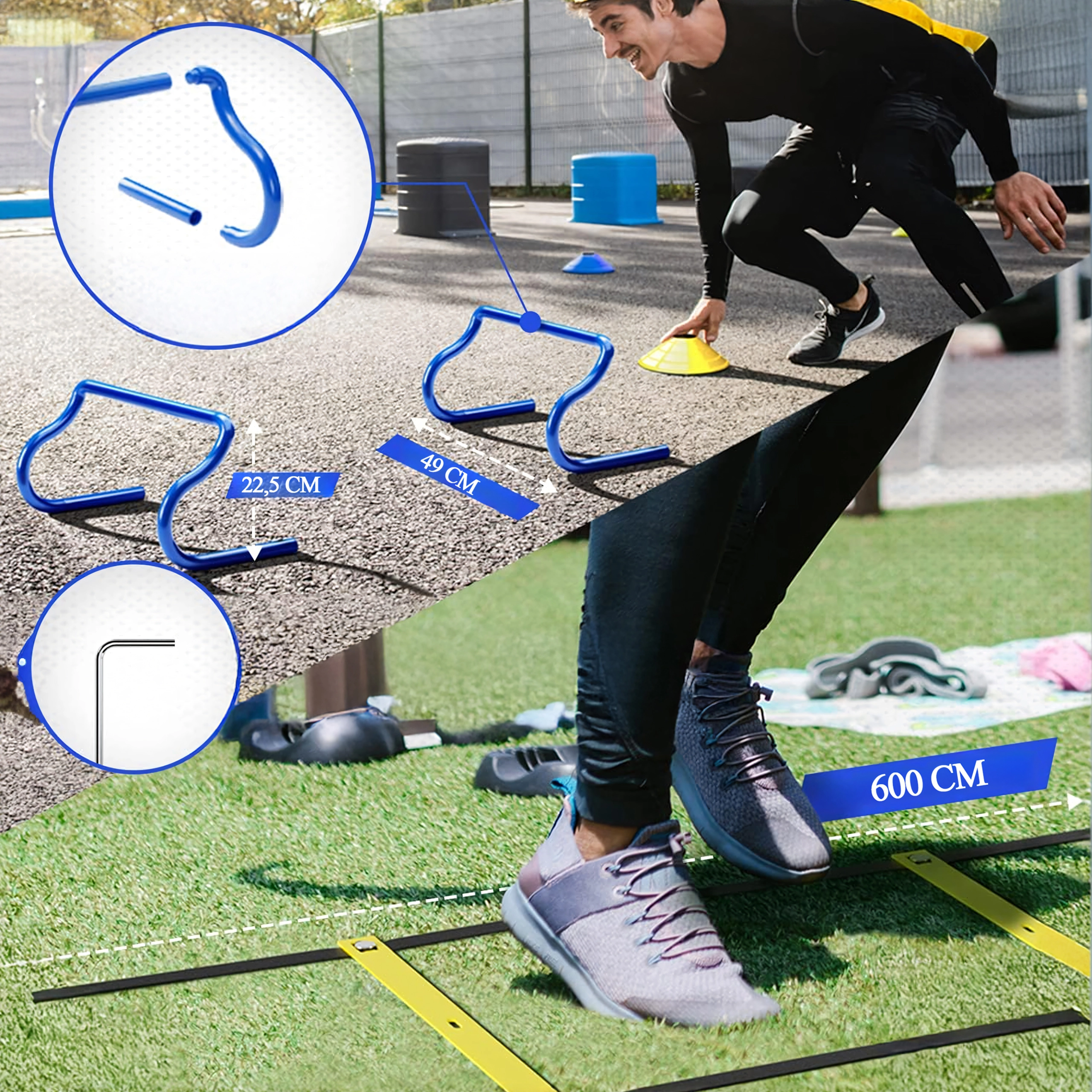Táto univerzálna tréningová sada XXL je navrhnutá pre športovcov všetkých úrovní. Pomáha efektívne rozvíjať rýchlosť nôh, akceleráciu, zmeny smeru aj koordinačnú presnosť. Všetky prvky sú ľahké, odolné a rýchlo pripravené na použitie ako na ihrisku, tak v telocvični.