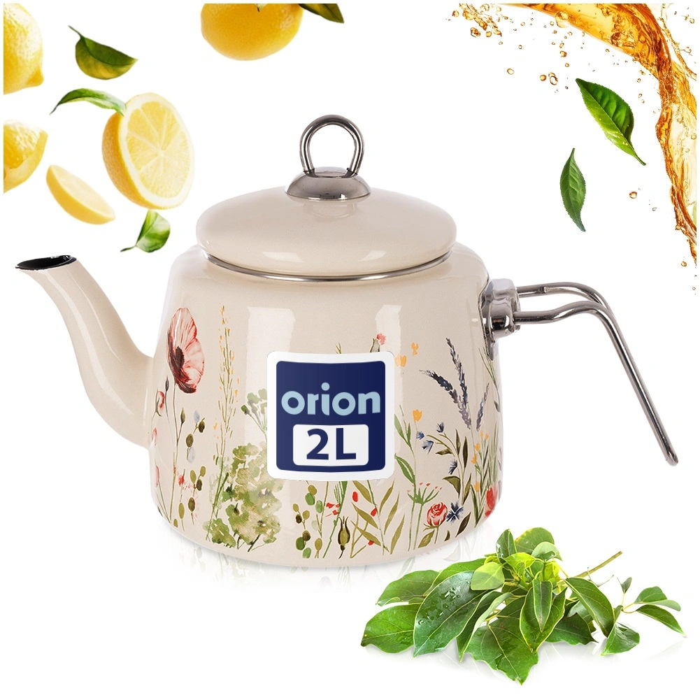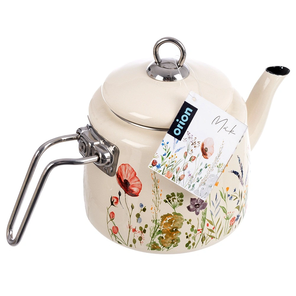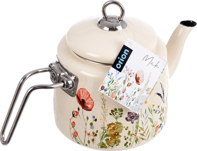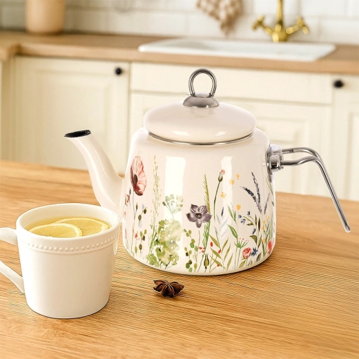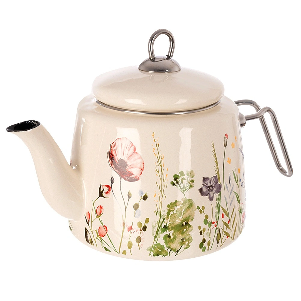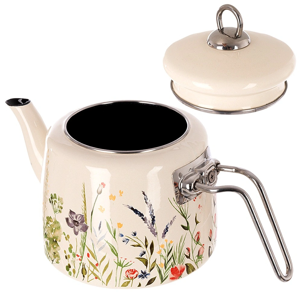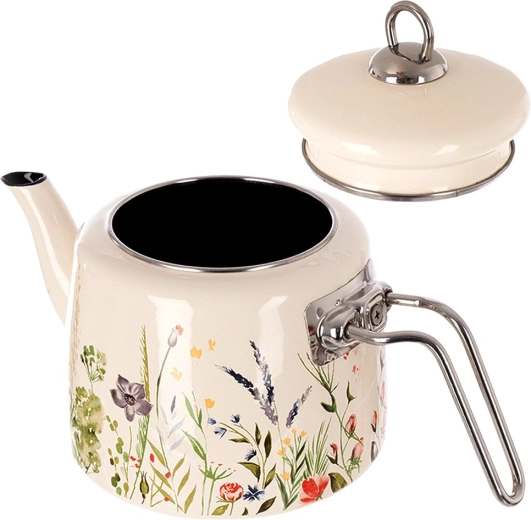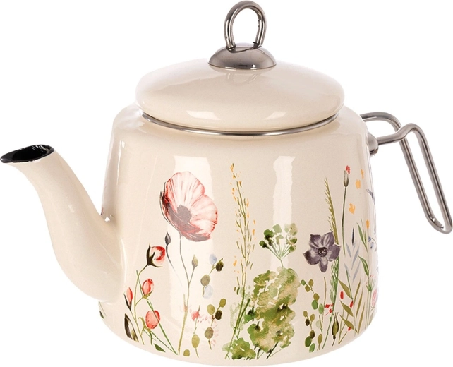 Elegantný smaltovaný čajník s objemom 1,6 l v krémovej farbe s motívom lúčnych kvetov. Vyrobený z kvalitnej smaltovanej ocele s nerezovými úchytmi, vhodný na všetky typy sporákov vrátane indukcie a je možné ho umývať v umývačke riadu. Praktická dobre priliehajúca pokrievka pomáha udržať teplo a pohodlne nalievať.