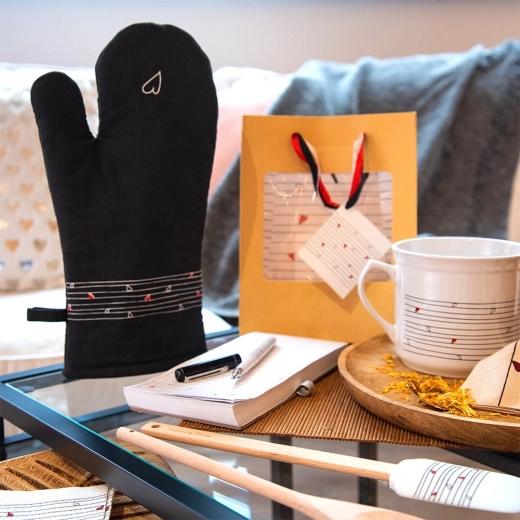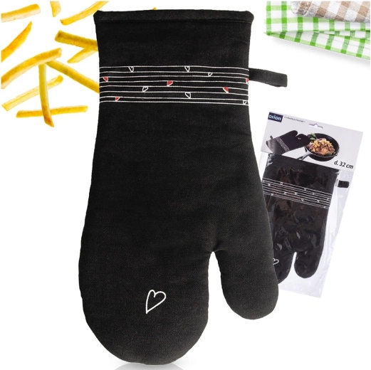 Praktická kuchynská rukavica zo 100 % bavlny v elegantnej čiernej farbe s jemným motívom srdca chráni ruky pred teplom a uľahčuje bezpečnú manipuláciu s riadom. Vďaka univerzálnej veľkosti 18 × 32 cm sadne na pravú aj ľavú ruku, integrovaný magnet a pútko na zavesenie zaistia, že ju budete mať vždy poruke. Možno prať do 30 °C.