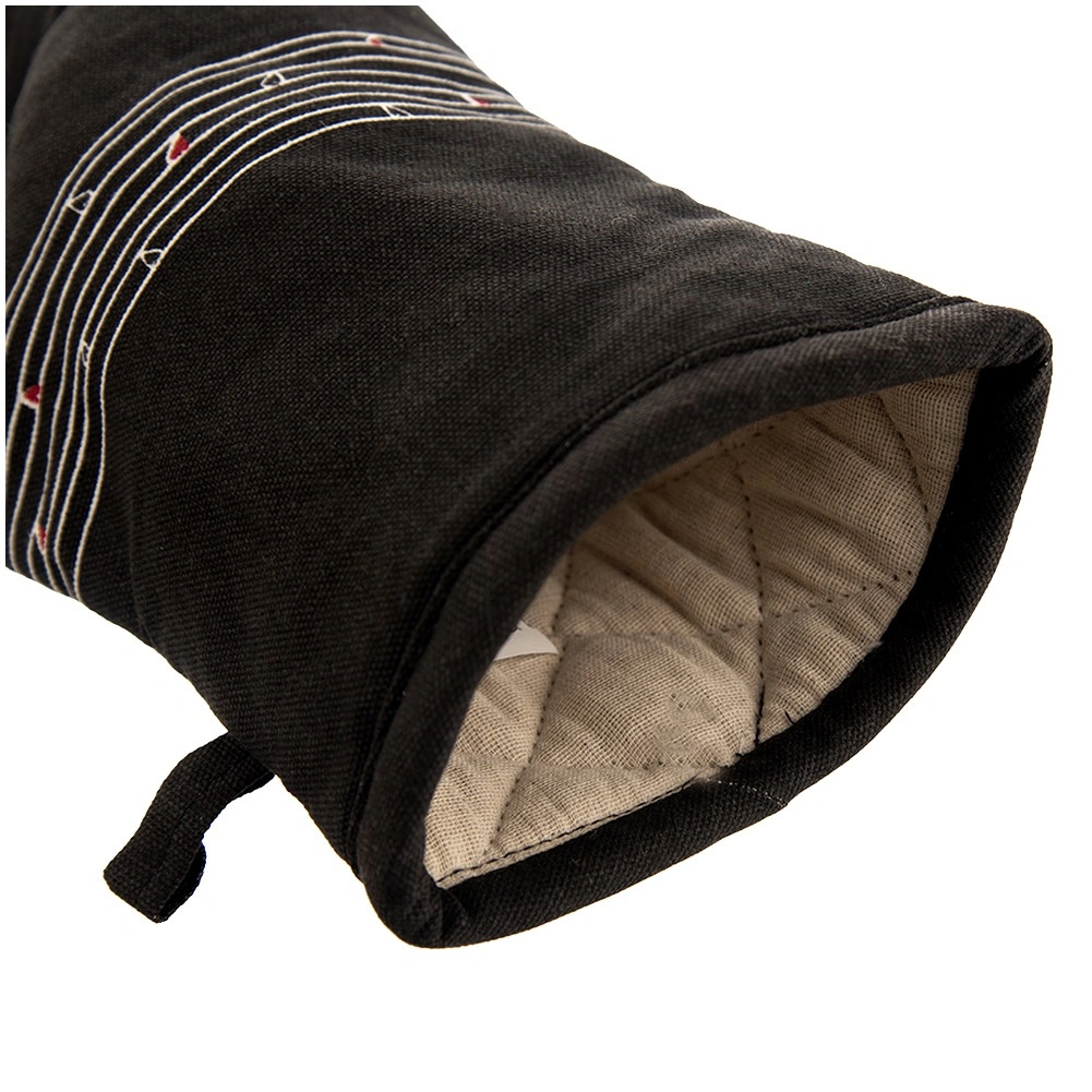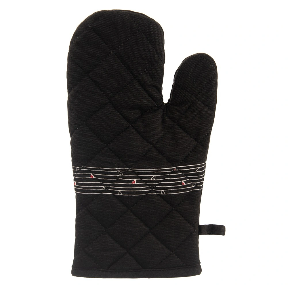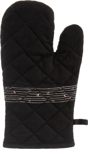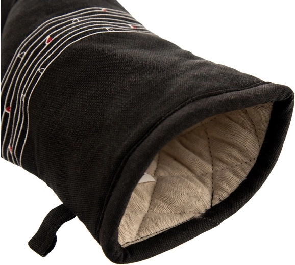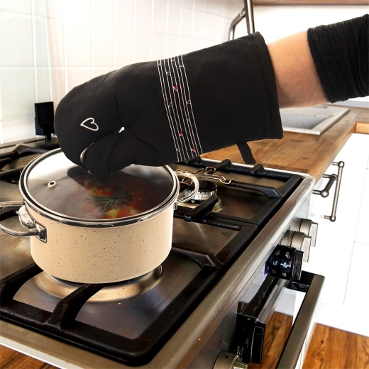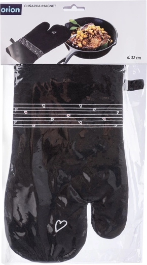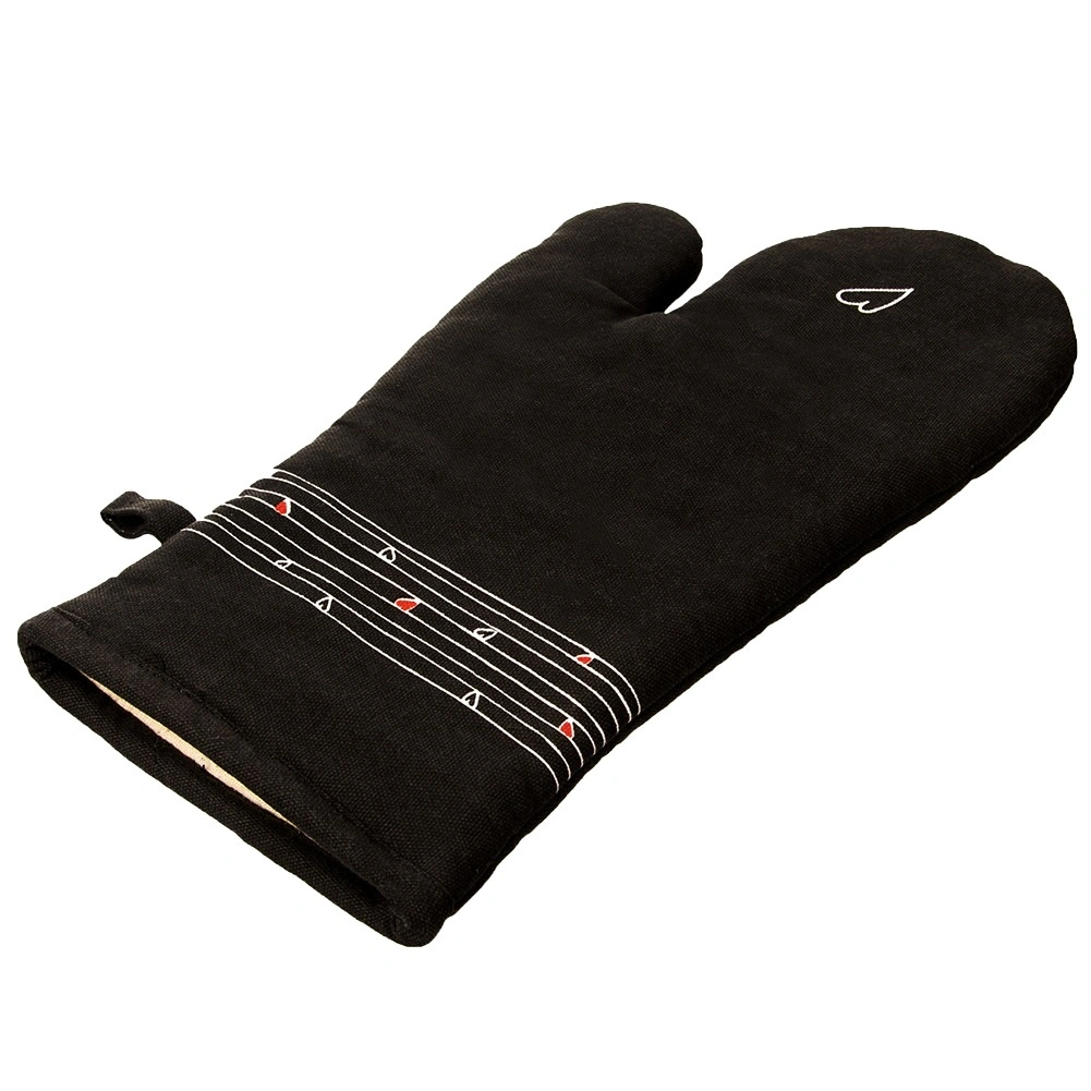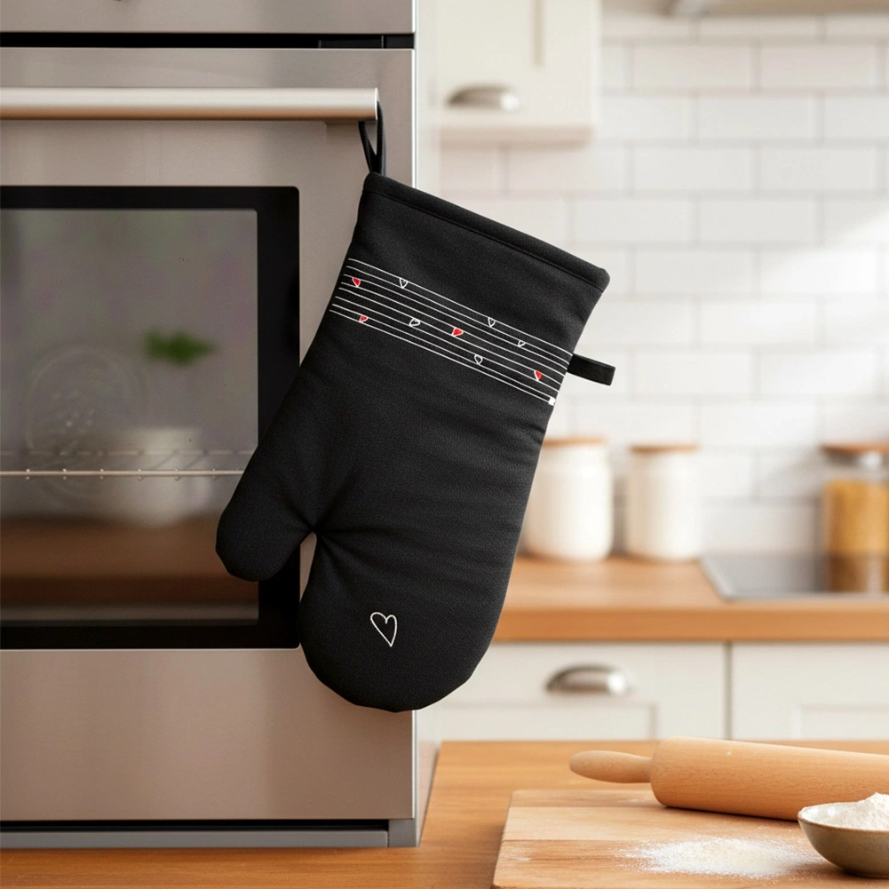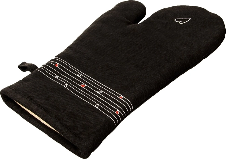 Táto odolná bavlnená rukavica je nenahraditeľným pomocníkom pri varení aj pečení. Vďaka kvalitnému prešívaniu a mäkkej výplni poskytuje spoľahlivú tepelnú ochranu a príjemne sedí na ruke. Elegantný čierny dizajn s decentným motívom srdiečok sa hodí do každej kuchyne.