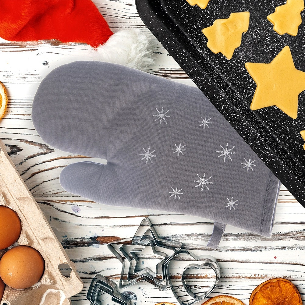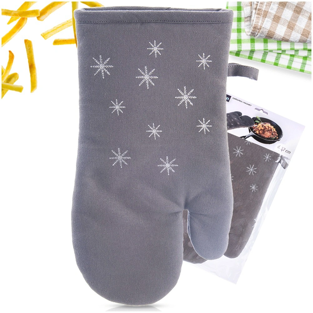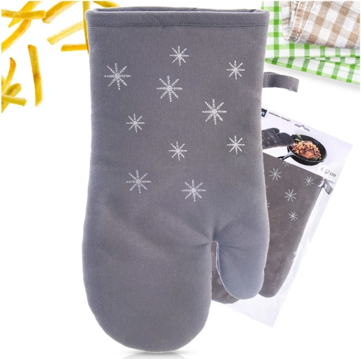 Štýlová a funkčná chňapka z bavlny s decentným vzorom snehových vločiek chráni ruky pri manipulácii s horúcimi plechmi, riadom a pekáčmi. Mäkké polstrovanie a plné zakrytie ruky zaisťujú bezpečný úchop a pohodlie pri každodennom varení.