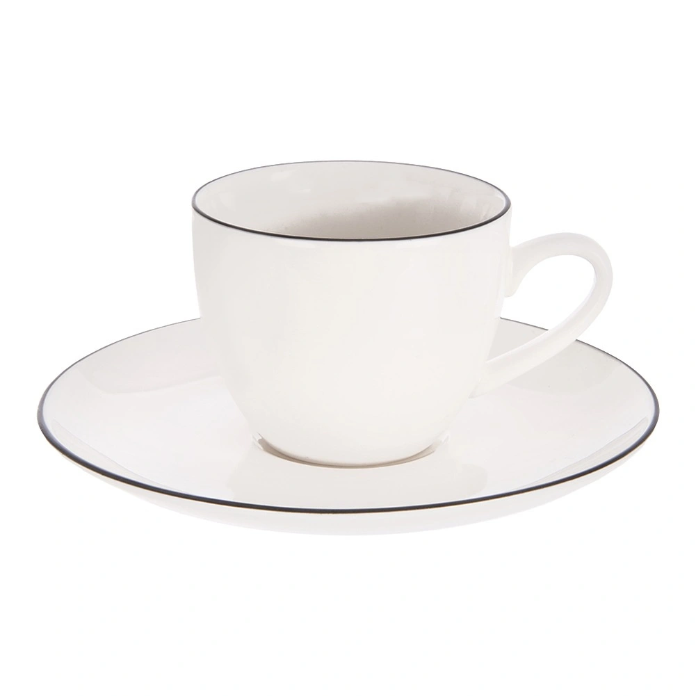 Elegantný porcelánový podšálok s priemerom 13 cm pre espresso. Minimalistický dizajn s tenkým tmavým lemom, nadčasový vzhľad, vhodný do umývačky a mikrovlnky, stabilná opora šálky a univerzálne použitie na servírovanie drobných dezertov.