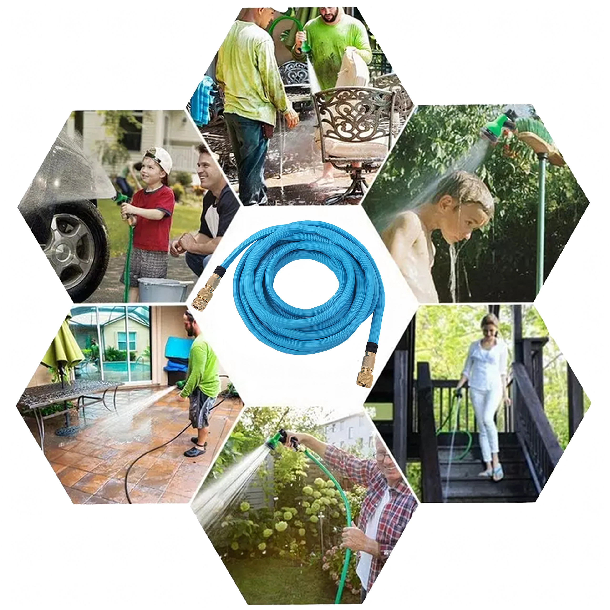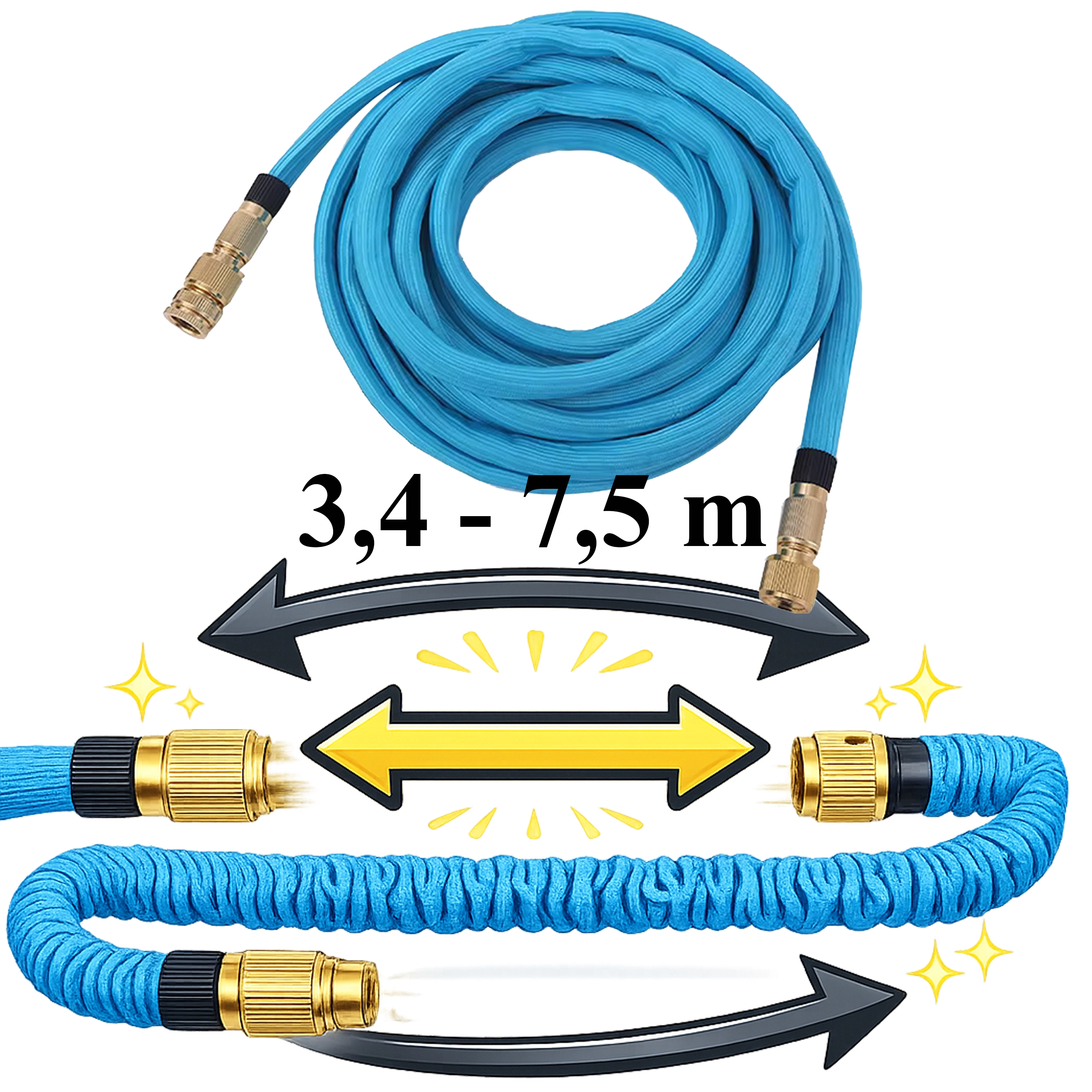 Táto rozťahovacia hadica je ideálna na polievanie záhrady, umývanie auta či upratovanie terasy. Po otvorení vody sa automaticky predĺži až na 7,5 m a po vypustení sa vráti na kompaktných 3,4 m. Mosadzné rýchlospojky s tesnením O-krúžkami zabezpečujú dlhú životnosť a minimálne riziko úniku.