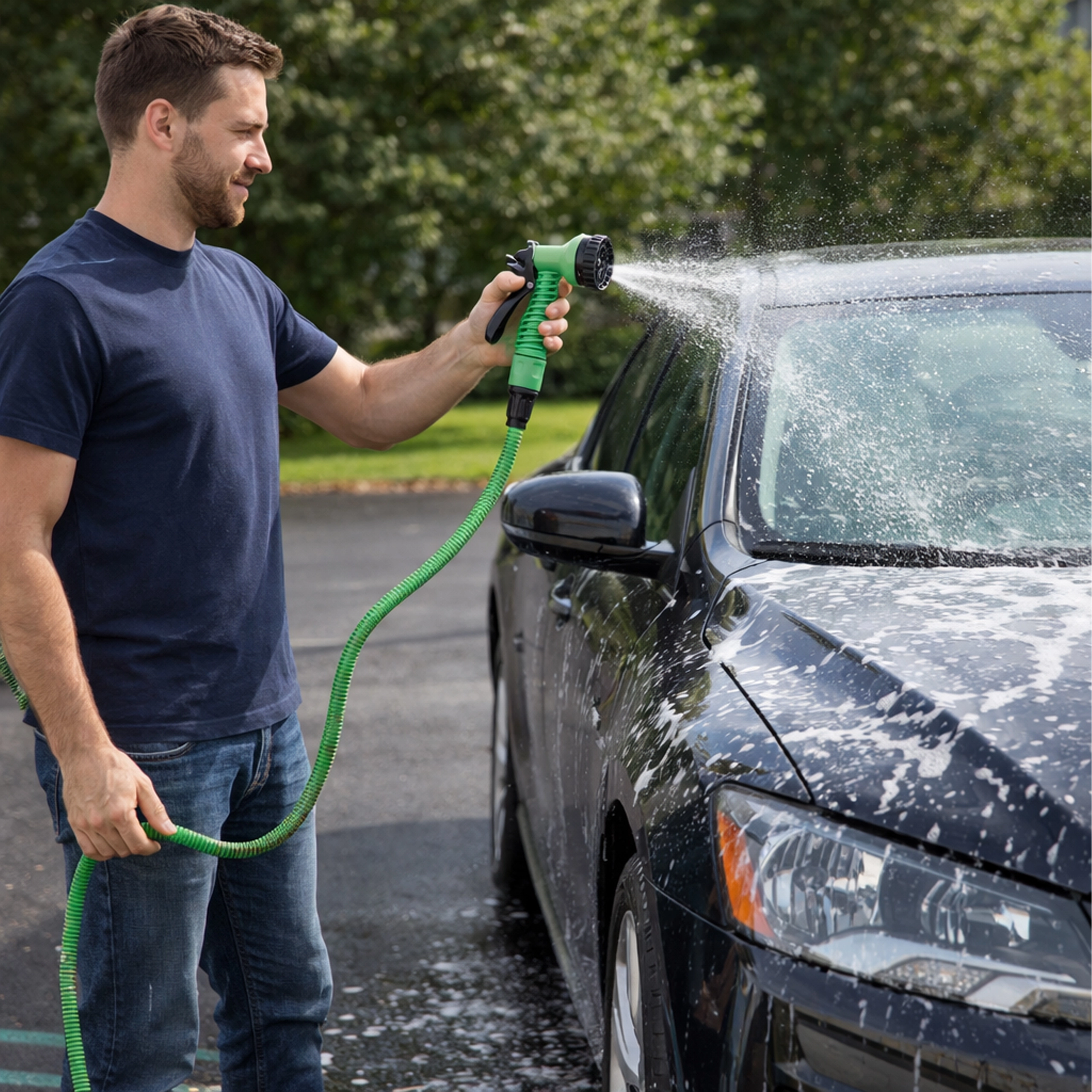 Ergonomická tryska s viacerými režimami postreku – od jemnej sprchy po silný prúd – na polievanie rastlín, oplach terás aj umývanie auta.