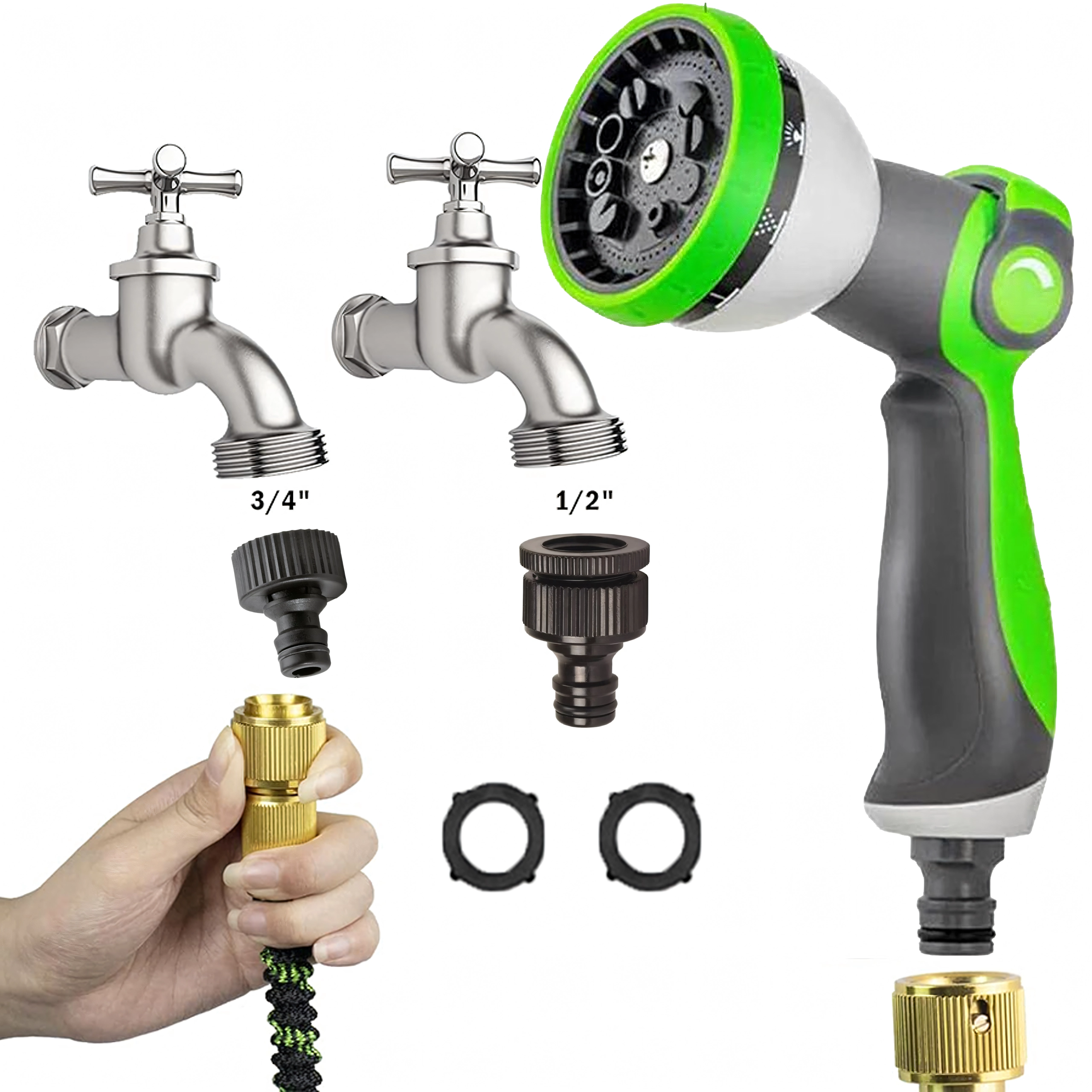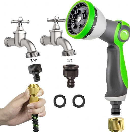 Kompaktná a ľahká rozťahovacia záhradná hadica 2,5–7,5 m s mosadznými konektormi 1/2" a 3/4" a viacrežimovou striekacou pištoľou. Odolný textilný plášť, ochrana proti zalomeniu a uzatvárací ventil pre pohodlné polievanie záhrady, umývanie auta aj upratovanie okolo domu.
