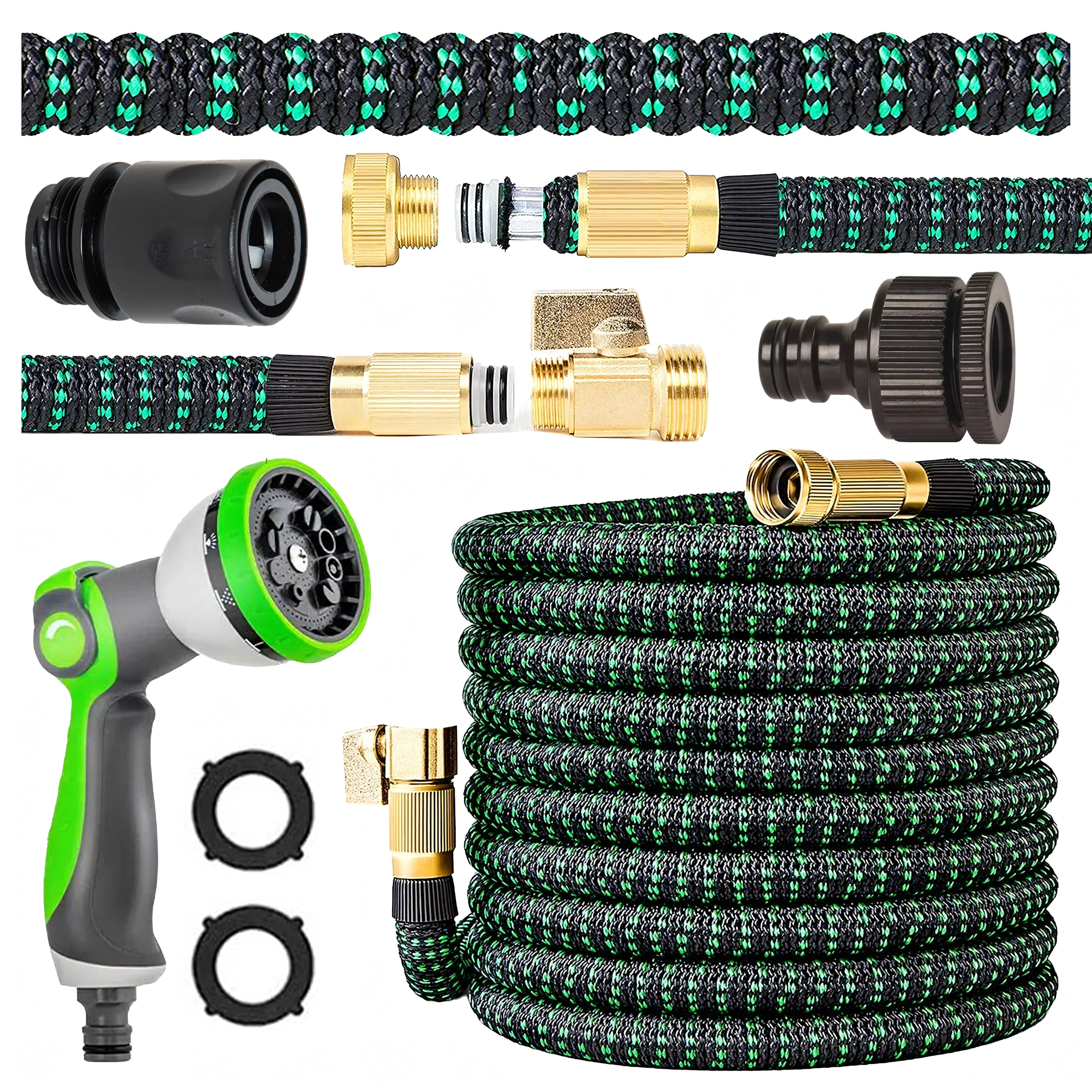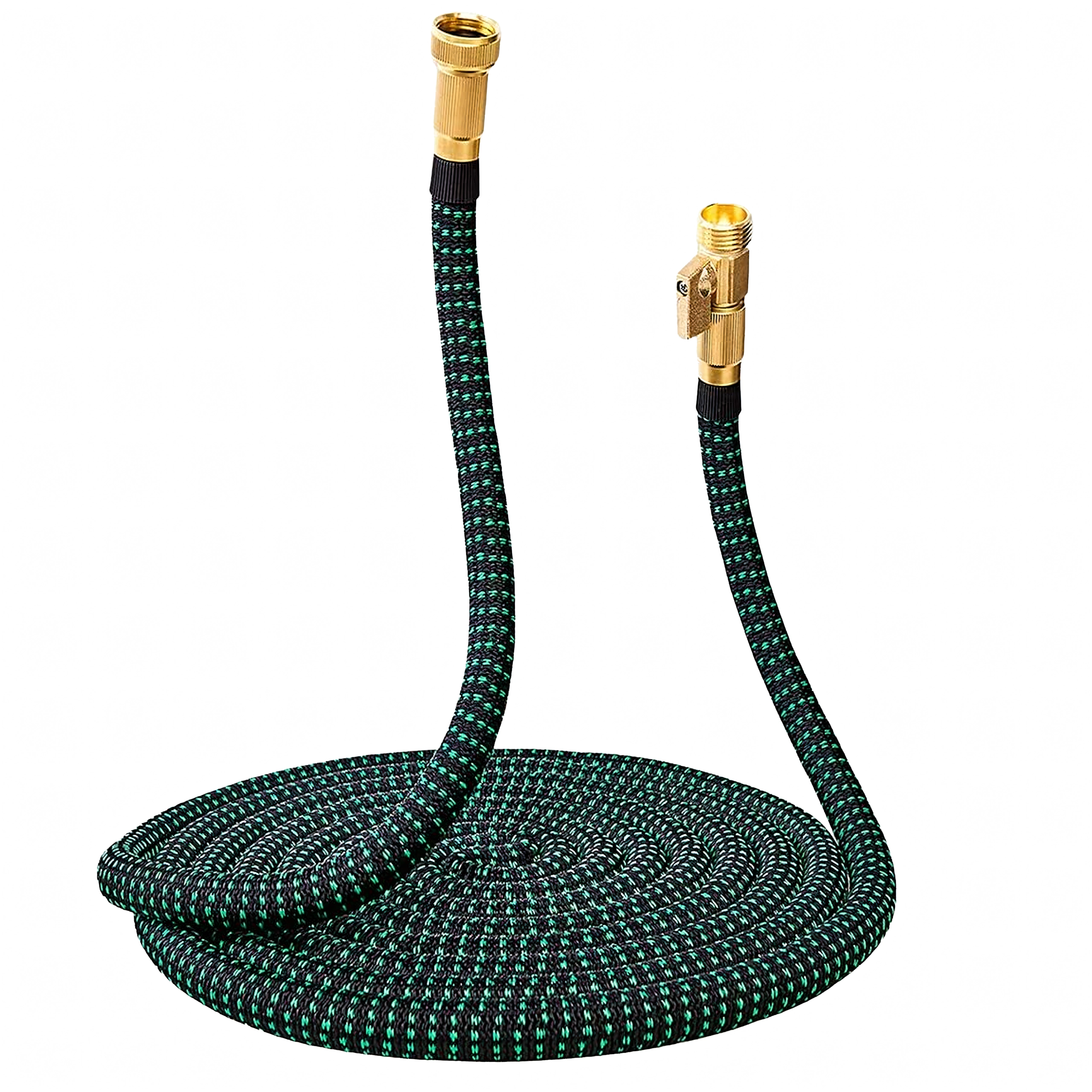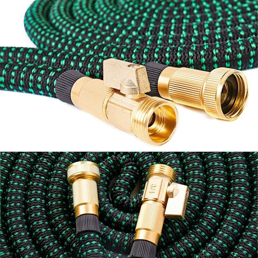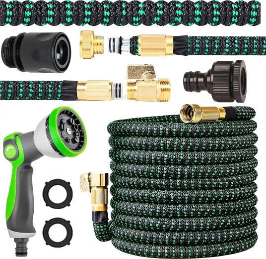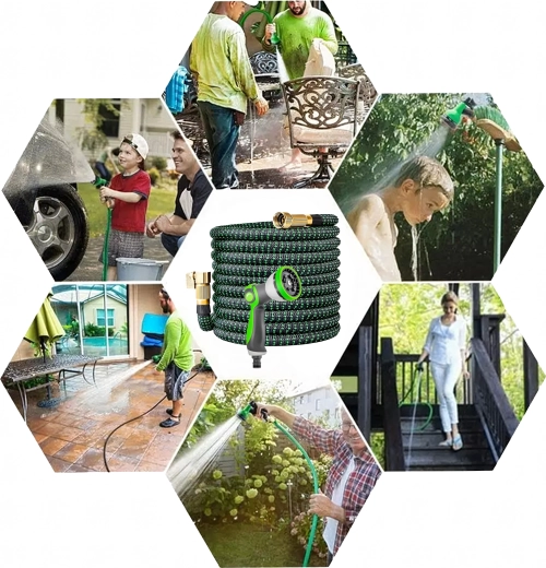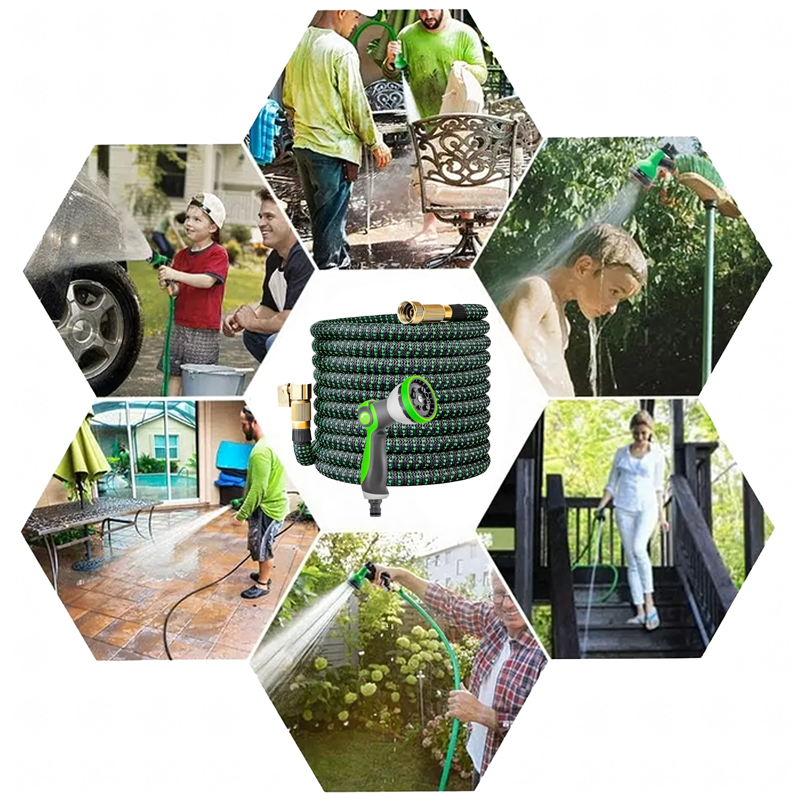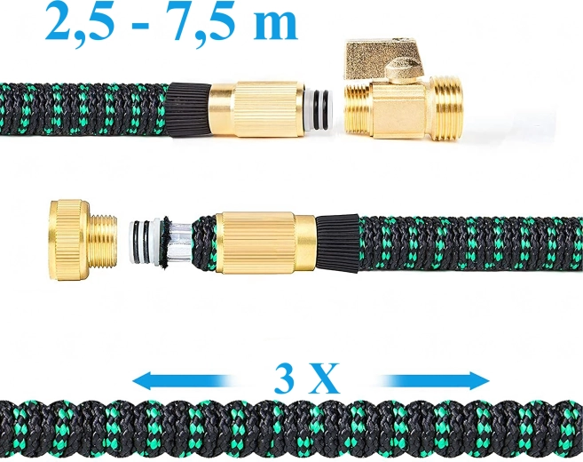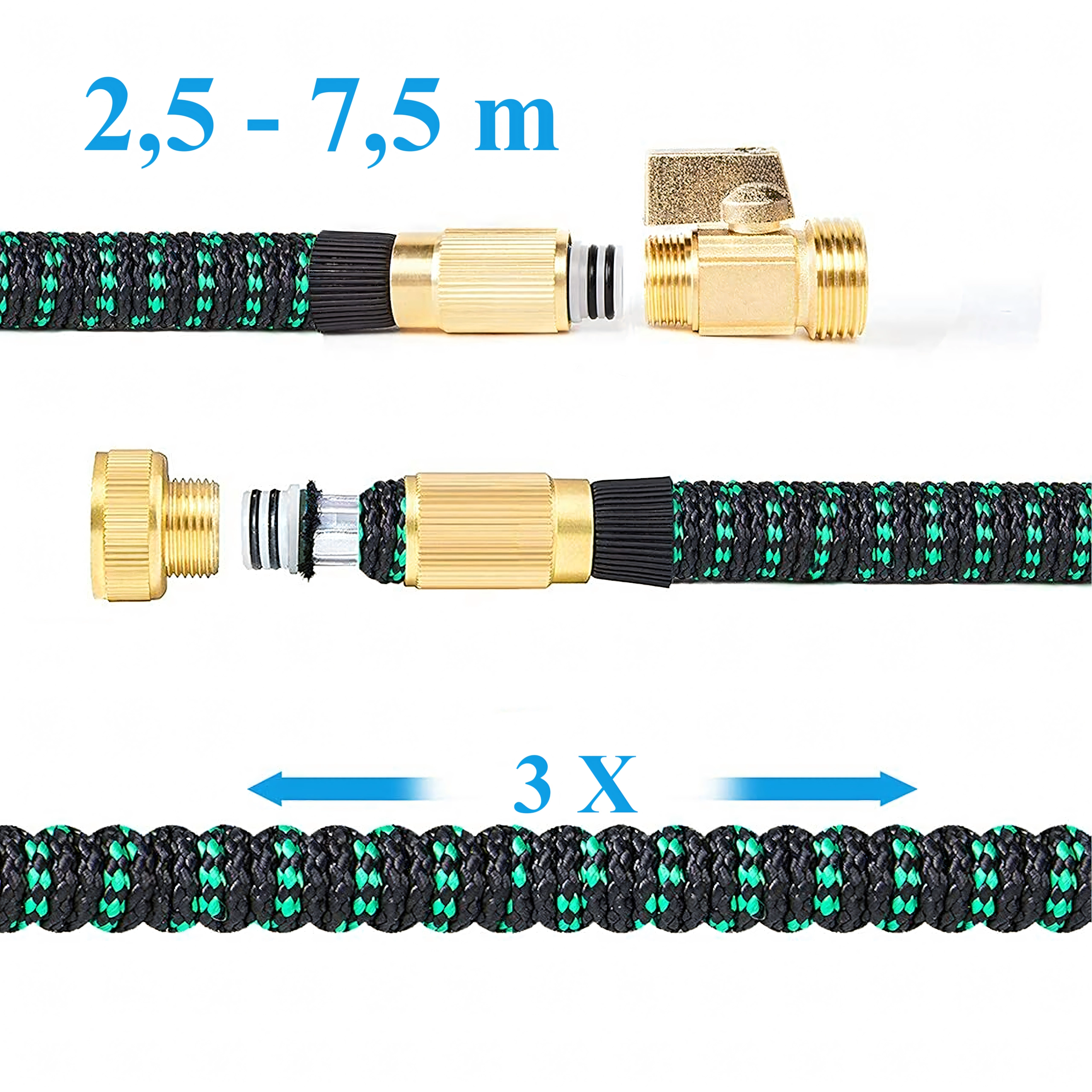 Táto rozťahovacia hadica sa po napustení vodou predĺži až na 7,5 m, po vypustení sa kompaktne zmrští pre jednoduché uloženie. Textilné opletenie v kombinácii s mosadznými rýchlospojkami zabezpečuje odolnosť, tesnosť a dlhú životnosť. Ergonomická postrekovacia pištoľ ponúka viac nastavení prúdu od jemnej hmly po silný lúč.