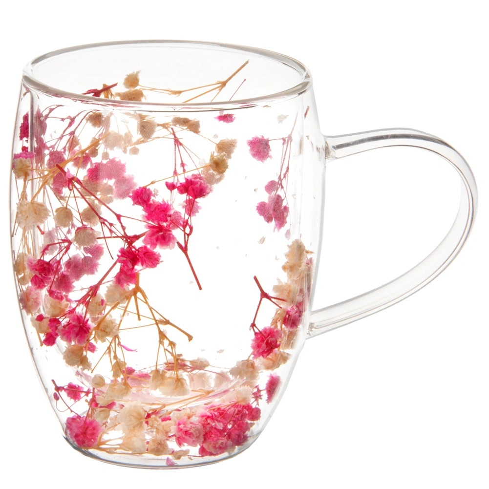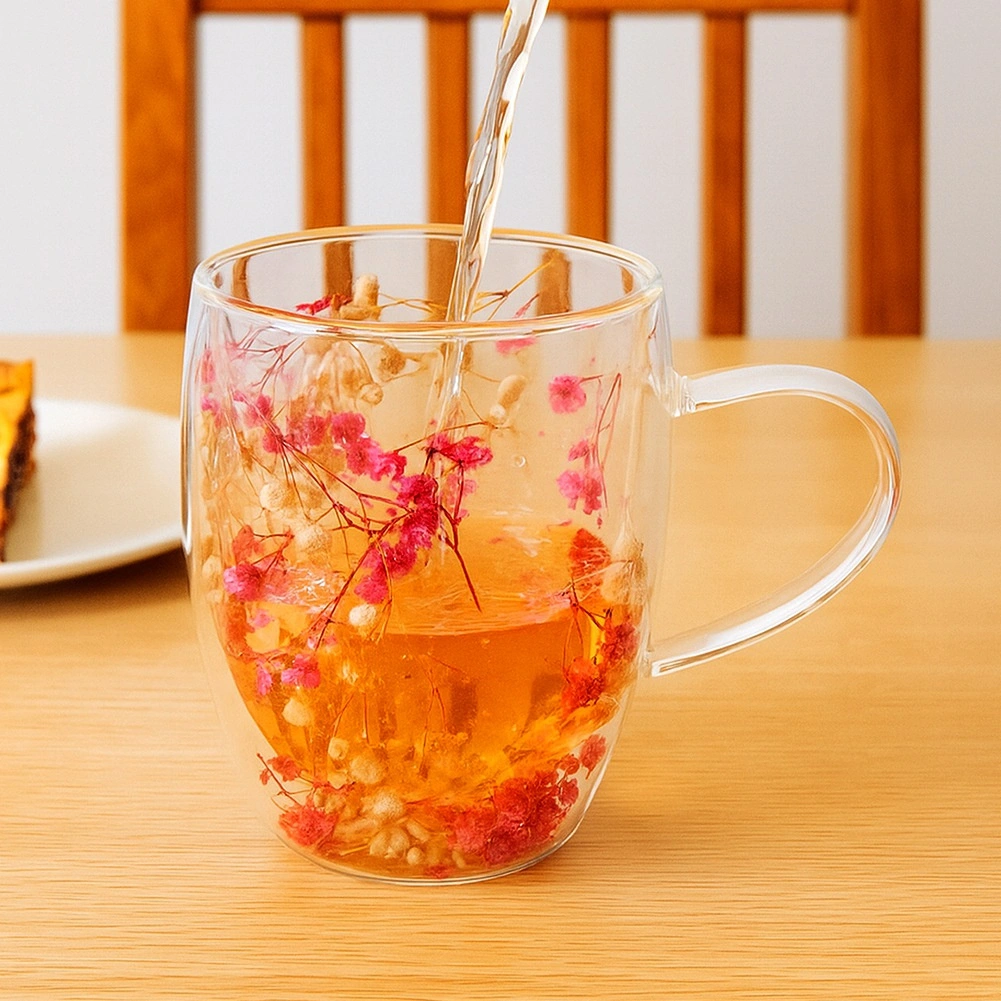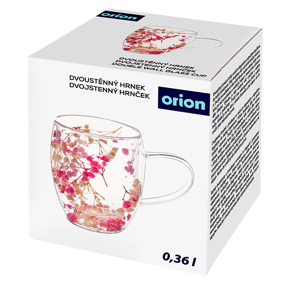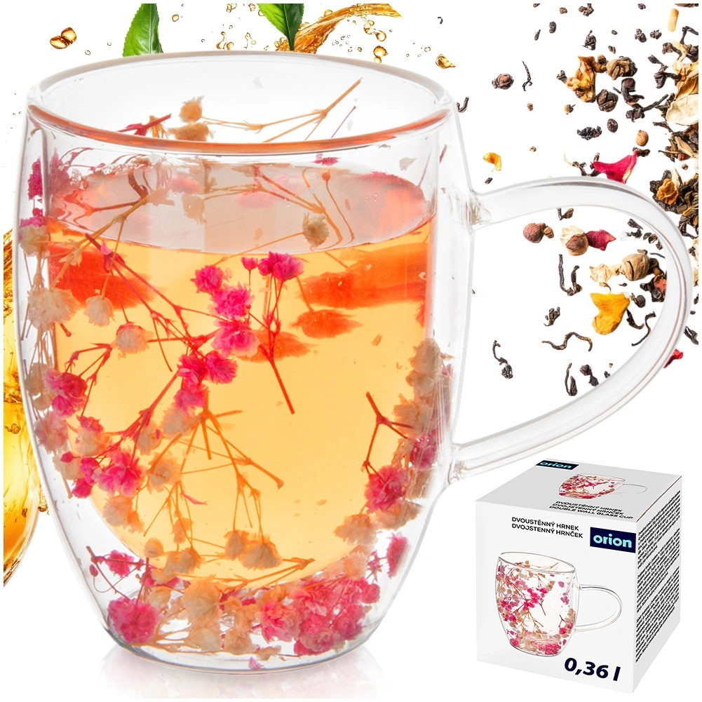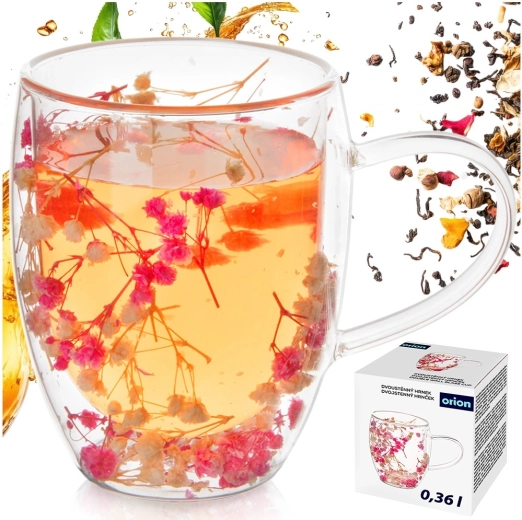 Medzi stenami sú uložené sušené kvety, ktoré vytvárajú jedinečný dekor viditeľný zo všetkých strán. Jednoduchý, okrúhly tvar a praktické uško sa pohodlne drží a hodí sa do každej kuchyne aj kancelárie.