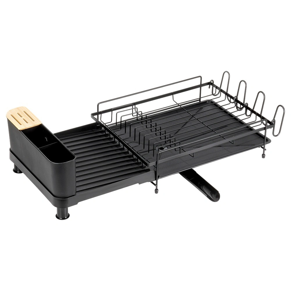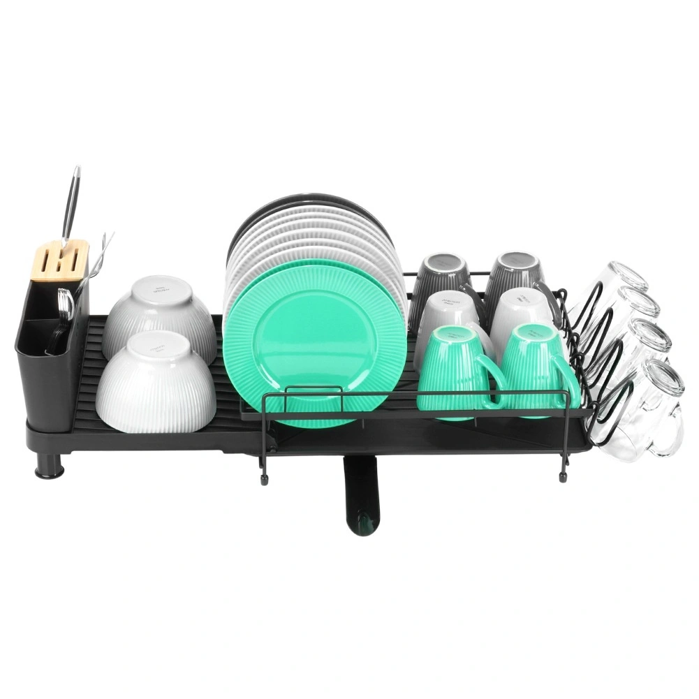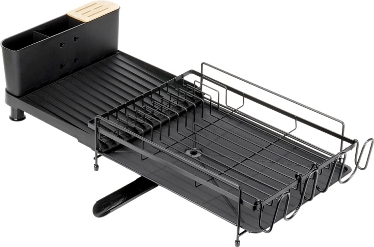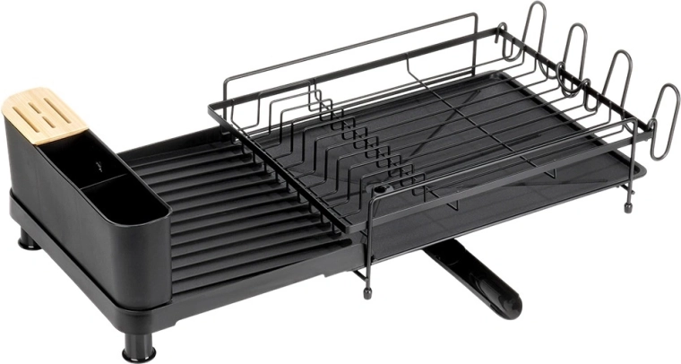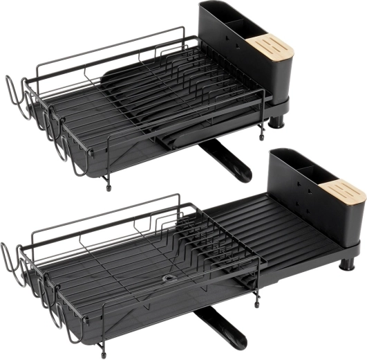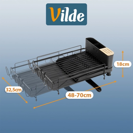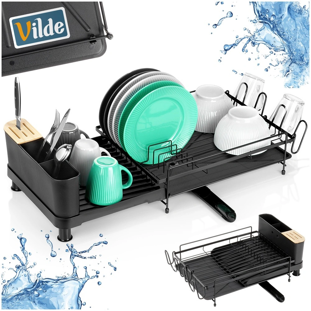 Praktická a štýlová odkvapkávacia miska na riad s plynule rozťahovateľnou šírkou 48–70 cm, veľkou kapacitou a účinným odvodom vody priamo do drezu. Pevná kovová konštrukcia v čiernej farbe, vyberateľná odkvapkávacia tácka a trojkomorový príborník s bambusovým blokom na nože zaistia poriadok, rýchle schnutie a suchú pracovnú dosku.