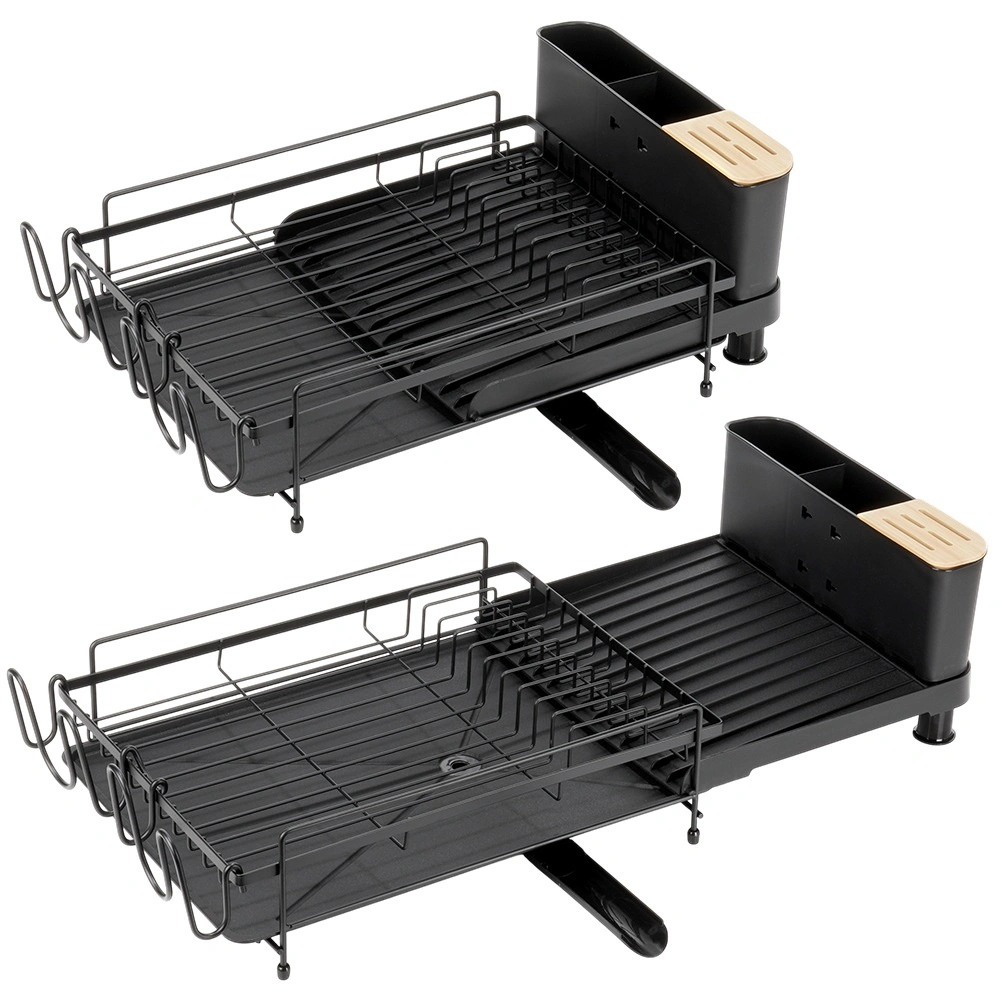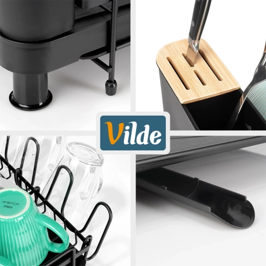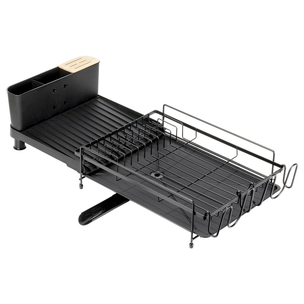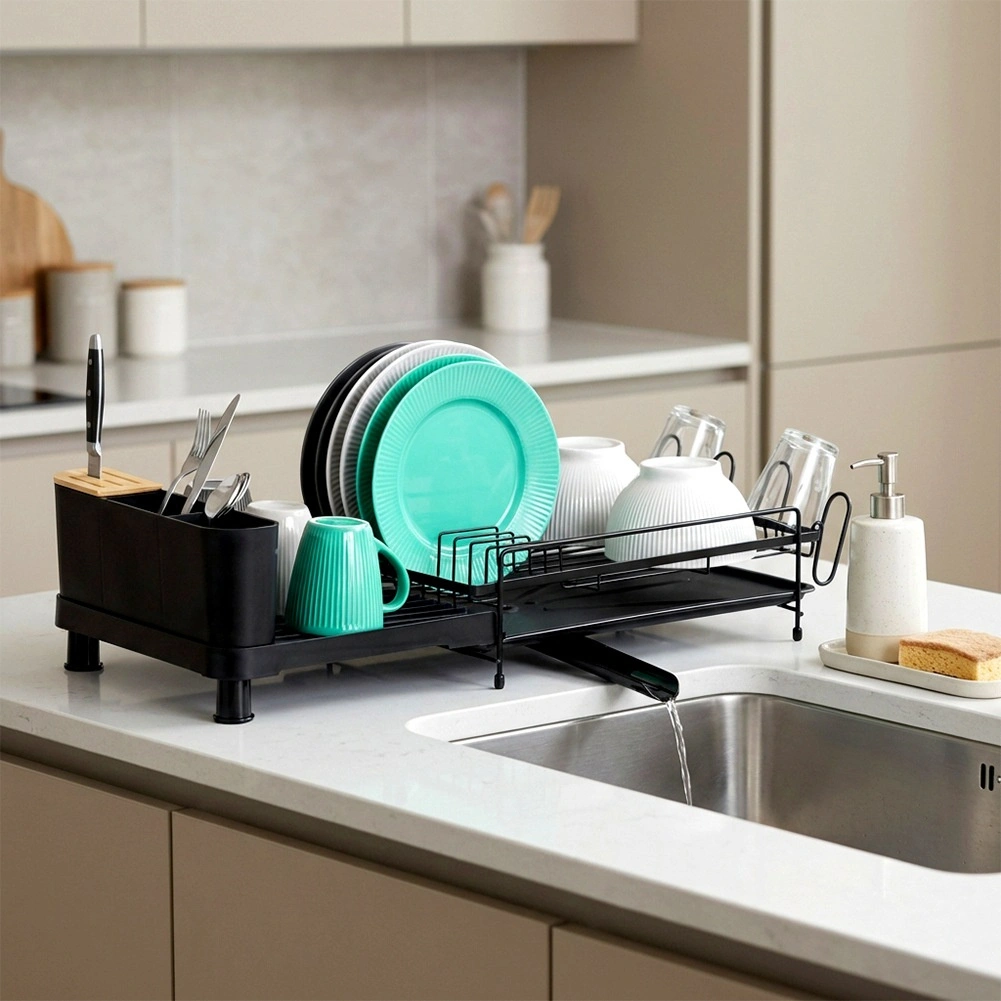 Praktická a štýlová odkvapkávacia miska na riad s plynule rozťahovateľnou šírkou 48–70 cm, veľkou kapacitou a účinným odvodom vody priamo do drezu. Pevná kovová konštrukcia v čiernej farbe, vyberateľná odkvapkávacia tácka a trojkomorový príborník s bambusovým blokom na nože zaistia poriadok, rýchle schnutie a suchú pracovnú dosku.