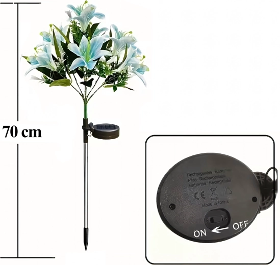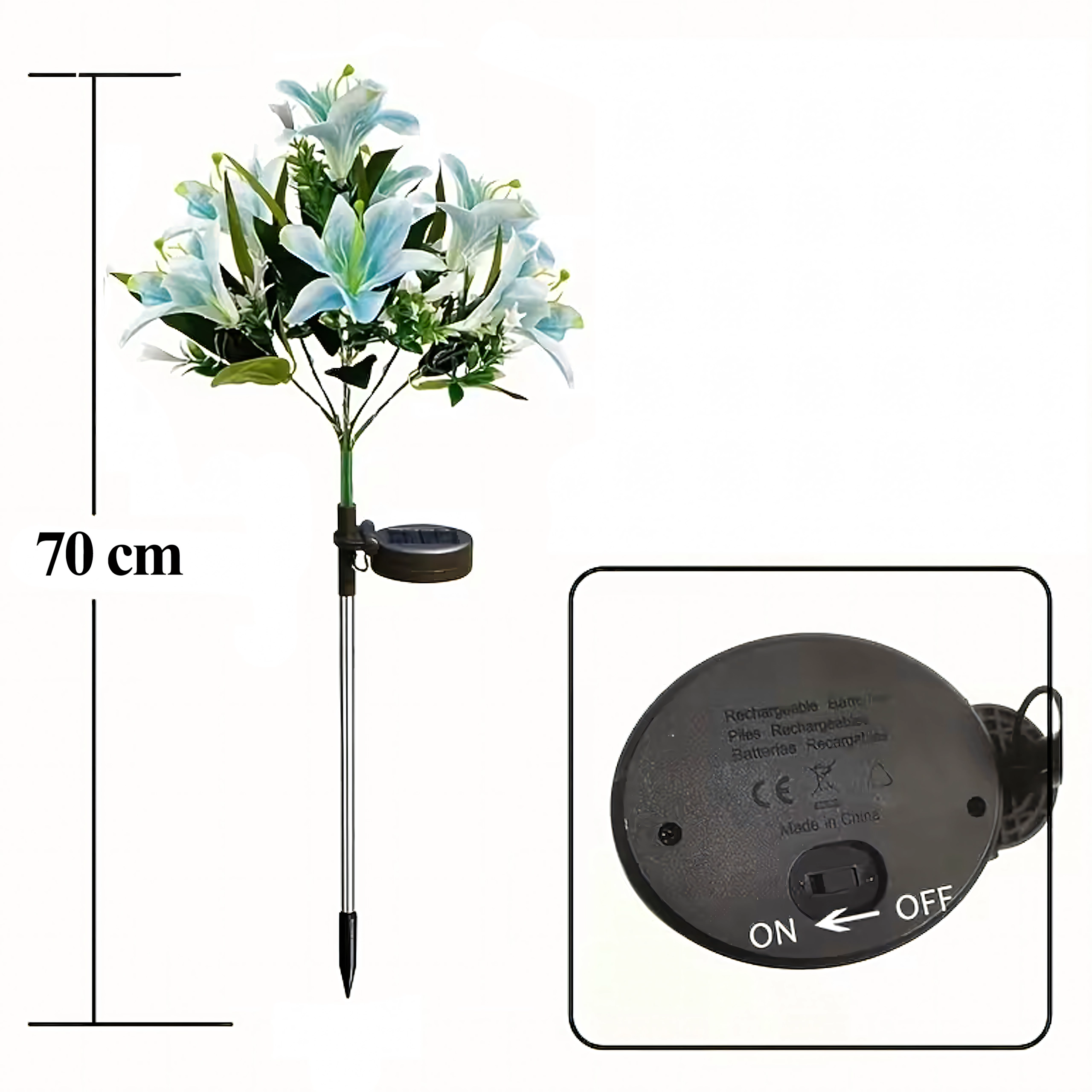 Solárne záhradné svietidlo v tvare ľalie premení chodníčky, záhony aj terasy na útulný, večerný raj. Počas dňa integrovaný solárny panel nabíja vstavaný akumulátor a po zotmení sa LED diódy automaticky rozsvietia, aby rozžiarili okvetné lístky jemným svetlom. Realistické listy a viac kvetov na jednom stonku dodajú priestoru prirodzený, dekoratívny vzhľad bez nutnosti údržby.