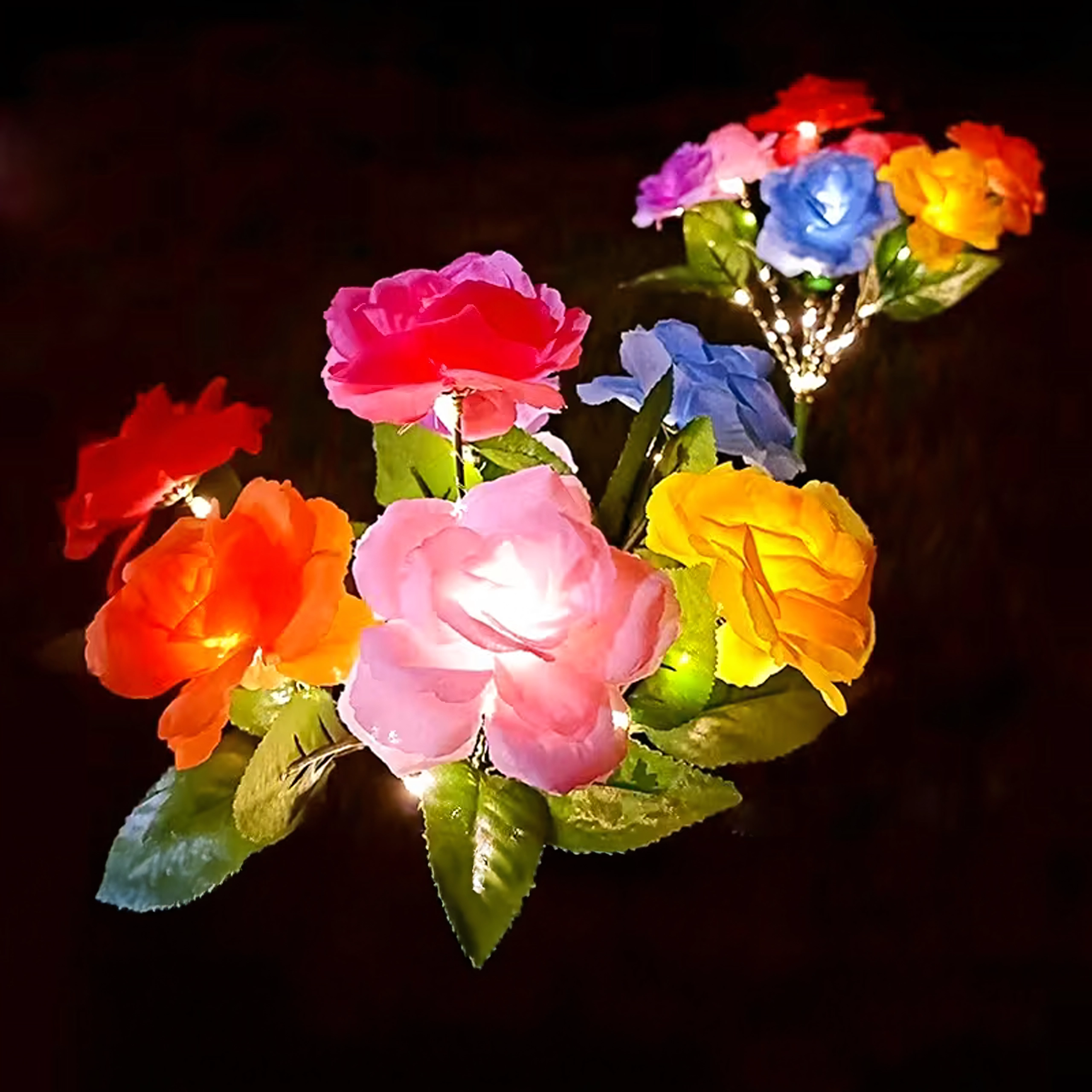 Mikro LED diódy s teplým odtieňom nežne presvetľujú farebné ruže a vytvárajú útulné ambientné osvetlenie pre záhradu, terasu či balkón.