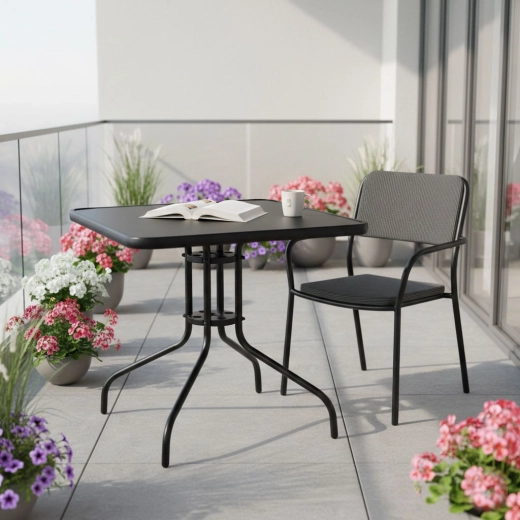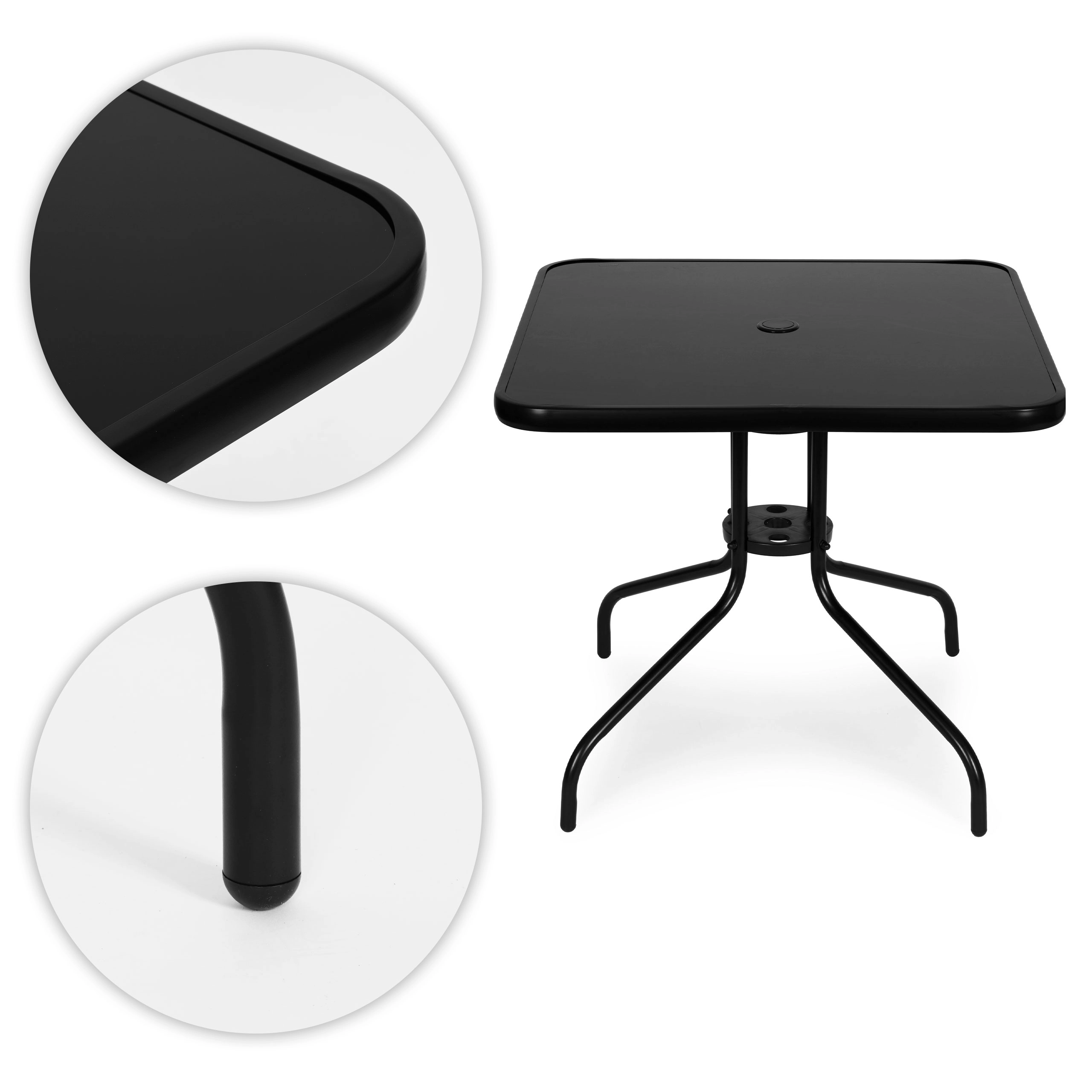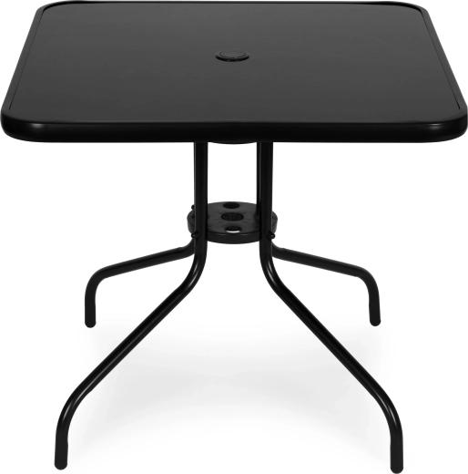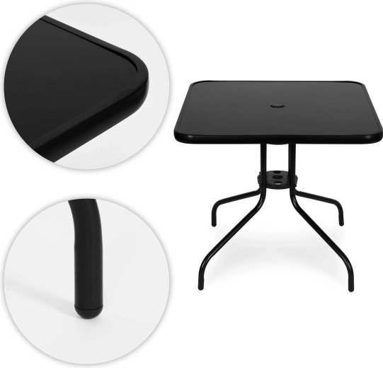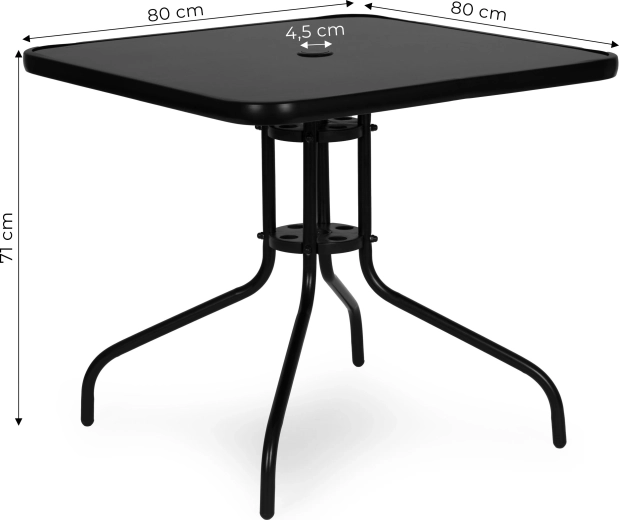 Elegantný záhradný stôl MultiGarden s doskou z tvrdeného skla 80 × 80 cm a otvorom pre slnečník (4,5 cm) je ideálny na balkón, terasu aj do záhrady. Odolná oceľová konštrukcia s práškovým lakom, stabilné spevnenie dvoma spojkami a protišmykové pätky zaisťujú dlhú životnosť a pohodlné používanie. Jednoduchá údržba a odolnosť voči poveternostným vplyvom robia zo stola praktický doplnok na každodenný relax.