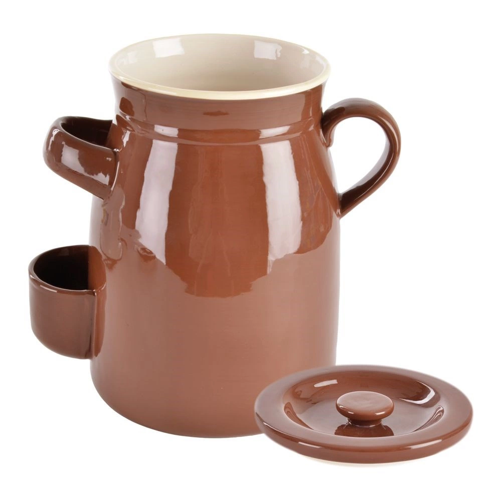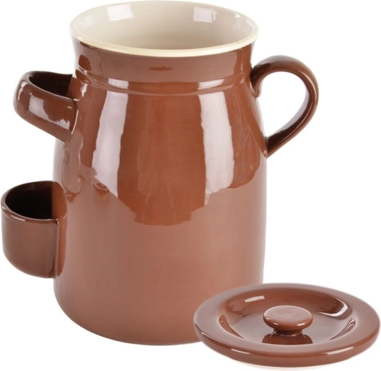 Kompaktný keramický kvasný hrniec s objemom 2,5 l so vzduchotesným vekom, praktickými ušami a drevenými kliešťami na jednoduché vyťahovanie pochúťok. Glazovaná keramika v hnedej farbe udržuje stálu teplotu a chráni obsah pred svetlom, čo podporuje správnu fermentáciu zeleniny, syrov či rýb v náleve, soli alebo octe.