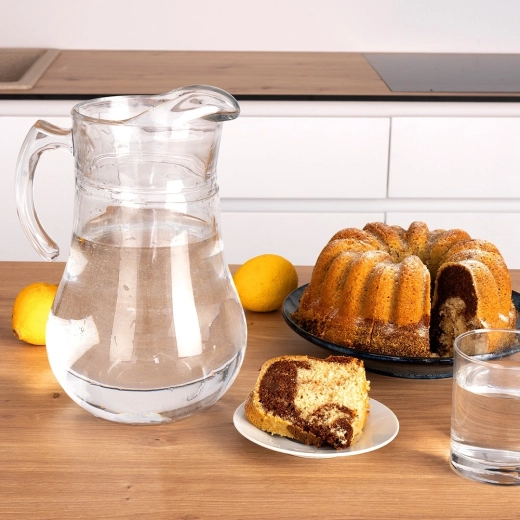 Džbán je vyrobený z kvalitného hrubostenného skla, ktoré je odolné a ľahko sa udržiava. Je vhodný na studené aj teplé nápoje – od vody a štiav cez limonády až po ľadový čaj či kompót. Po použití ho môžete bez obáv vložiť do umývačky riadu.