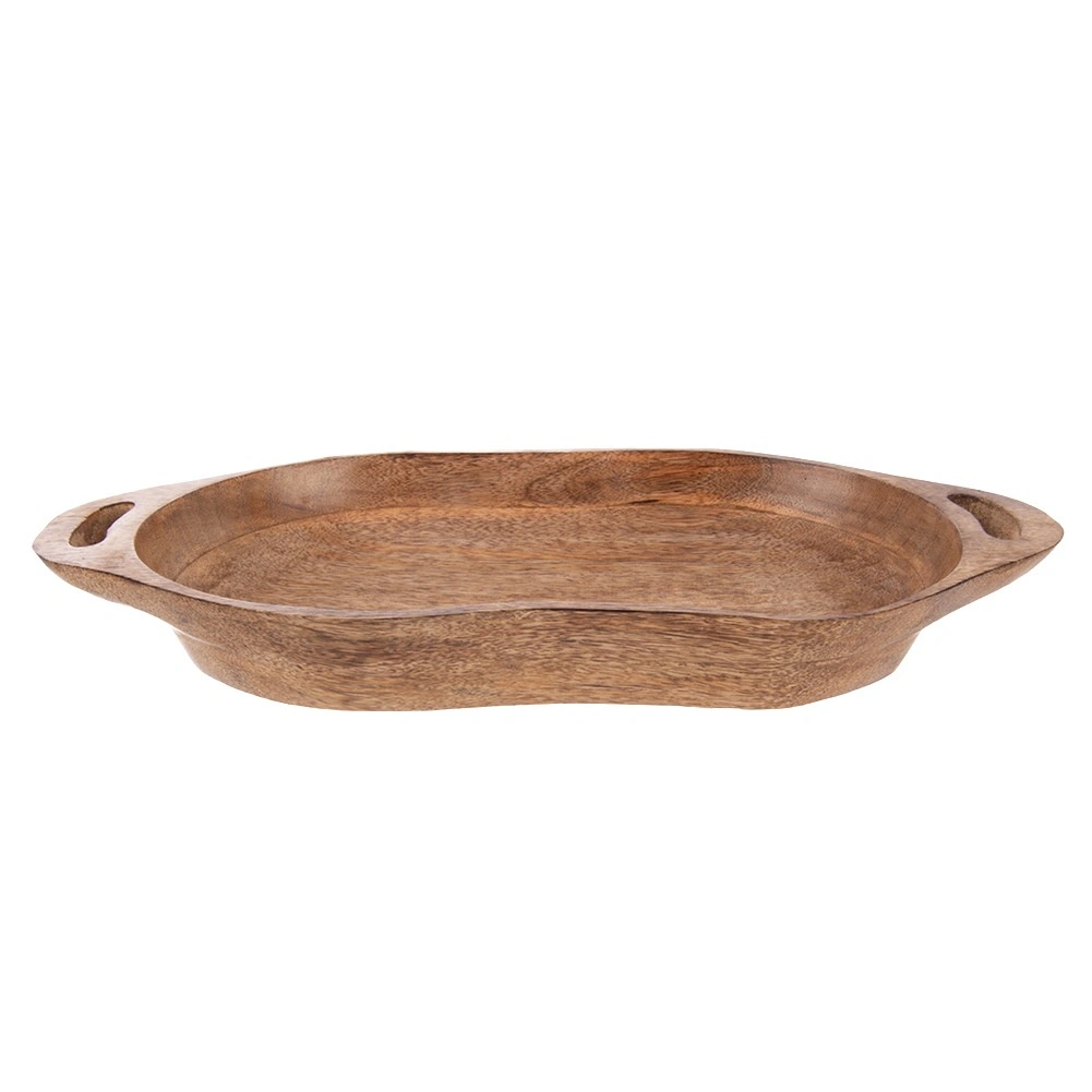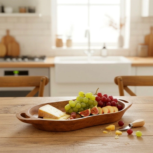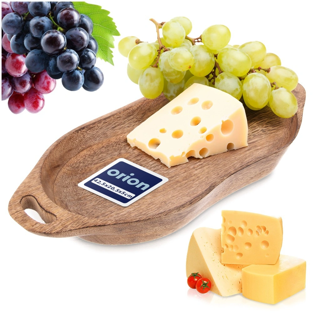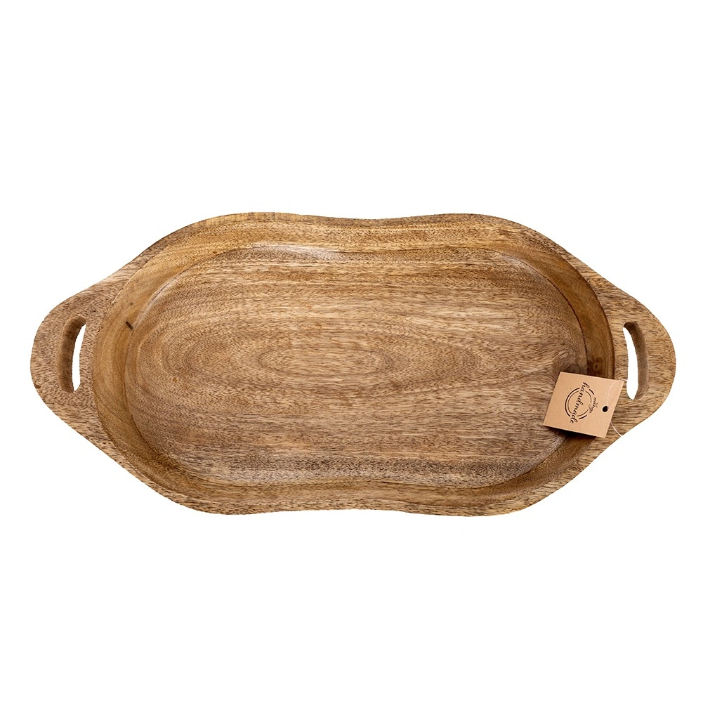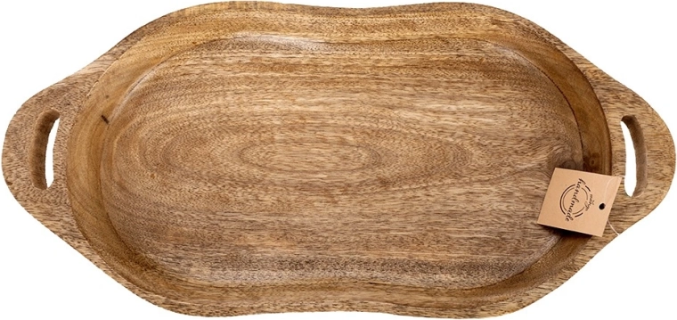 Elegantný drevený servírovací táck z mangového dreva s integrovanými úchytmi pre pohodlné prenášanie a bezpečné servírovanie. Vďaka prírodnej kresbe dreva a zvýšenému okraju je ideálny na syry, ovocie, dezerty aj snacky, ale aj ako štýlová dekorácia do kuchyne či obývačky.