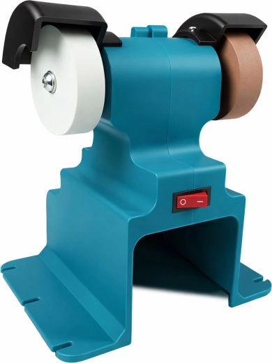 Kompaktná akumulátorová stolná brúska s dvojitým kotúčom na presné brúsenie a leštenie kovov aj nástrojov. Ponúka dve rôzne brúsne plochy (jemný biely kotúč a hrubší hnedý kotúč), bezpečnostné kryty, stabilnú základňu a prevádzku na 2× Li‑ion akumulátor pre slobodu bez kábla.