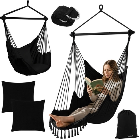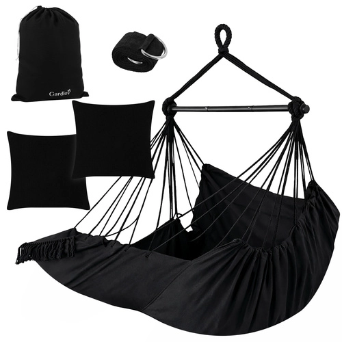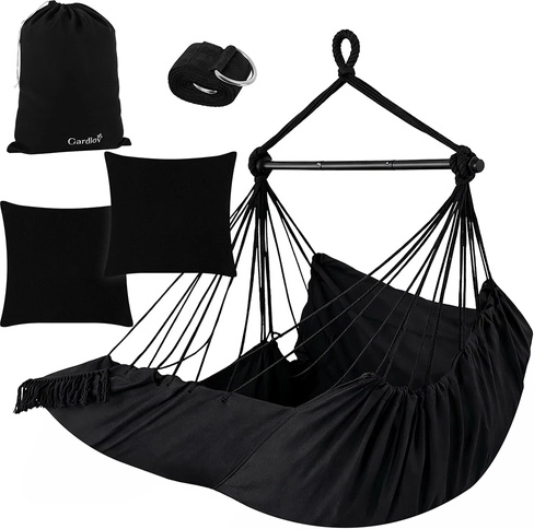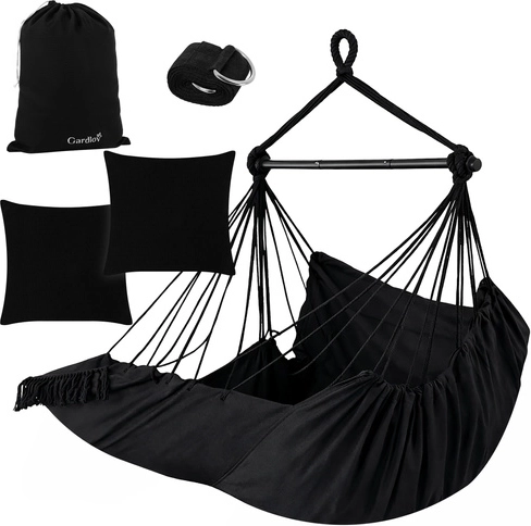 Brazílske závesné kreslo GARDLOV premení balkón, záhradu aj obývačku na útulnú zónu pokoja. Pevná bavlnená látka 320 g/m², stabilná kovová rozpieracia tyč a nosnosť 150 kg zaručujú bezpečie a pohodlie. V balení nájdete 2 mäkké vankúše, popruh na zavesenie a prepravný vak na ľahké prenášanie.