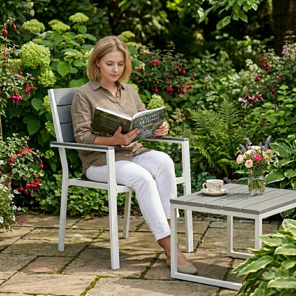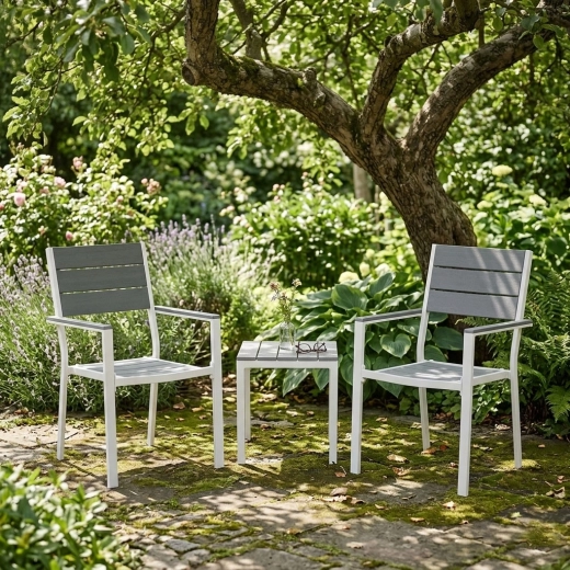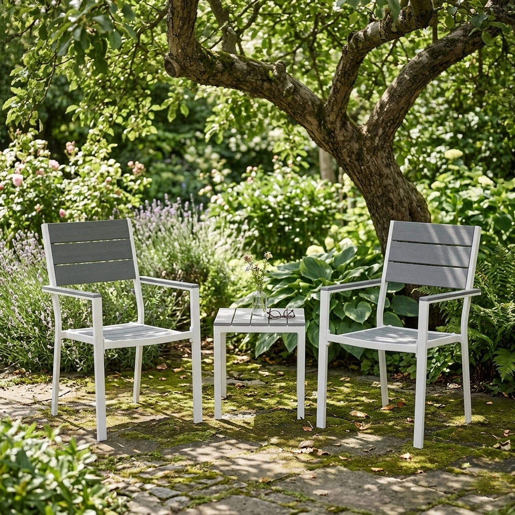 Práškovolakov aný oceľový rám poskytuje vysokú odolnosť proti korózii, zatiaľ čo výplne z HDPE sú ľahké, pevné a ľahko sa čistia. Materiály zvládajú vlhkosť aj teplotné výkyvy, takže sa kreslá skvele hodia na celosezónne použitie na terase aj v záhrade.
