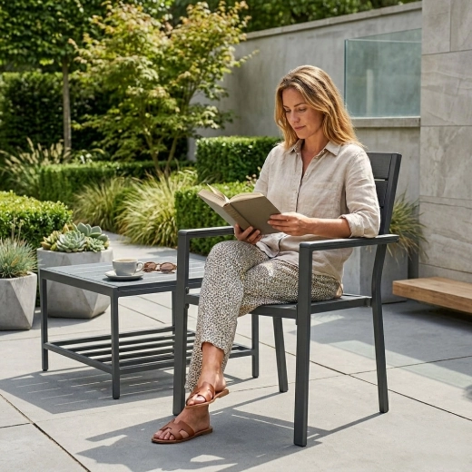 Čisté línie, širší sedák a rovné podrúčky ladia s modernou aj klasickou terasou. Ideálne na relax, čítanie aj posedenie pri nápojoch.