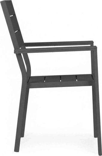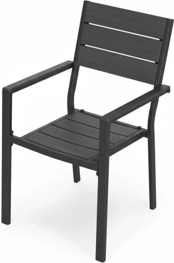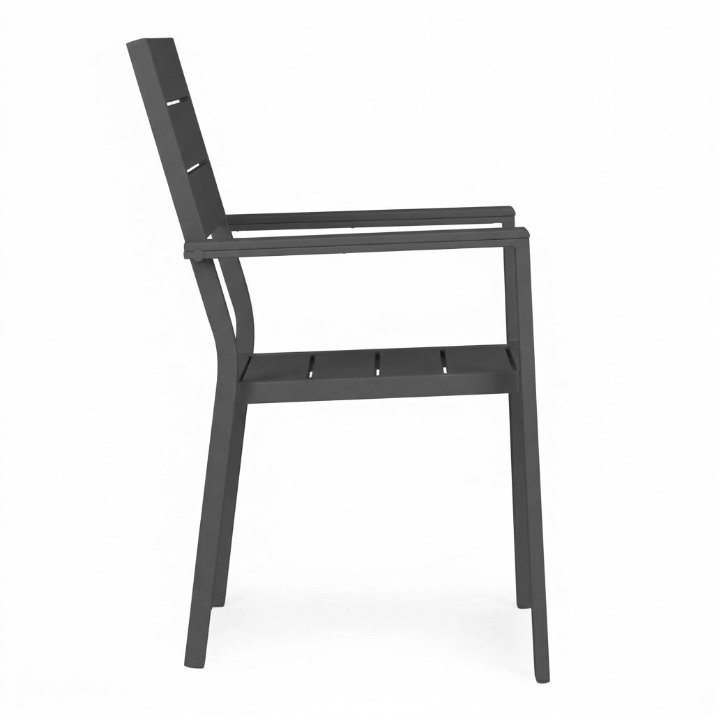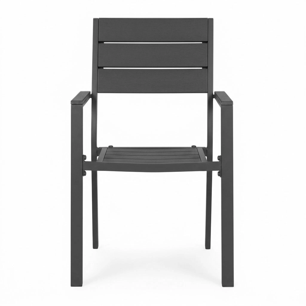 Konštrukcia z práškom lakovanej ocele je pevná a odolná proti korózii, zatiaľ čo sedák a operadlo z HDPE zabezpečujú komfort, ľahké čistenie a rýchle odvodnenie po daždi. Stabilná základňa, široké sedadlo a rovné podrúčky podporujú príjemné sedenie aj pri dlhšom používaní.