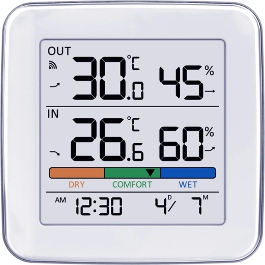 Veľký LCD zároveň zobrazuje vnútornú a vonkajšiu teplotu a vlhkosť, doplnené o farebnú škálu komfortu pre rýchle vyhodnotenie prostredia.