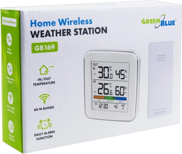 GREENBLUE GB169 je kompaktná a štýlová meteostanica na každodennú kontrolu klímy. Na veľkom displeji súčasne zobrazí vnútornú aj vonkajšiu teplotu, vlhkosť, čas a dátum, doplnené o farebný indikátor komfortu (Dry/Comfort/Wet) pre rýchle vyhodnotenie prostredia.