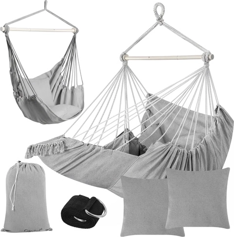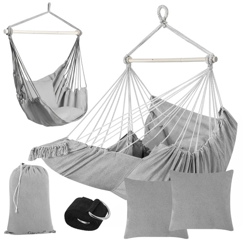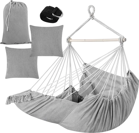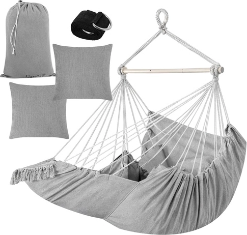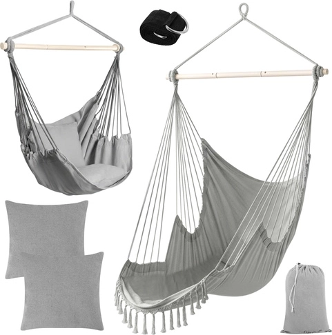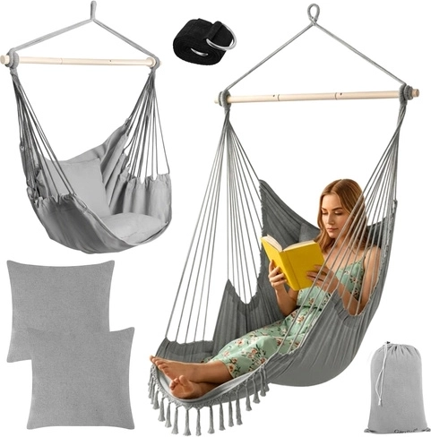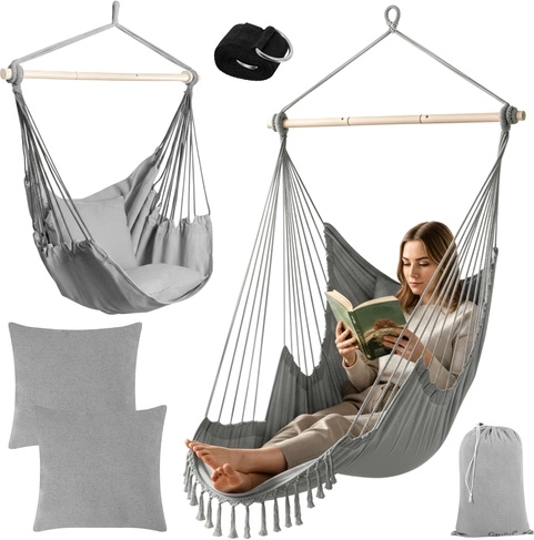 Súčasťou je všetko, čo potrebujete: 2 veľké vankúše na okamžité pohodlie, závesný popruhový pás s kovovým krúžkom na rýchlu inštaláciu a úložný vak. Látku kresla možno prať na 30 °C, takže údržba je hračka.