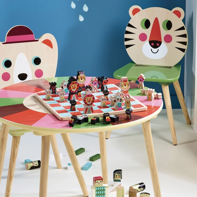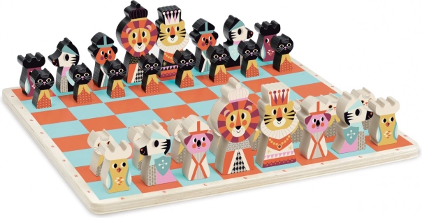 Šachové figúrky sú ilustrované ako rôzne zvieratá, čo robí hru zaujímavou a príťažlivou pre malé deti.