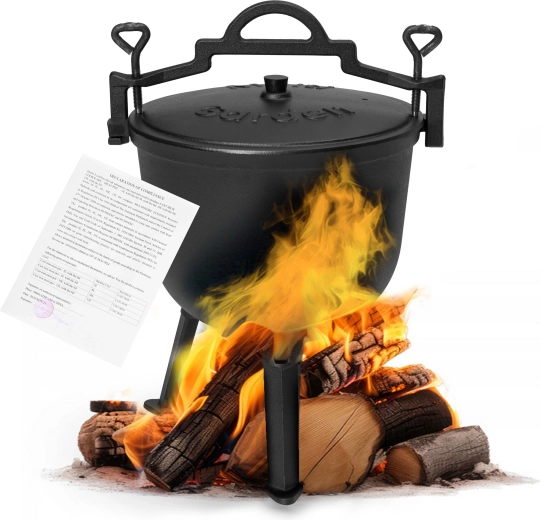 Robustný liatinový kotlík s objemom 10 l je ideálny na vonkajšie varenie na ohni, kempovanie aj záhradné párty. Vďaka liatine rovnomerne rozvádza teplo na pomalé dusenie, varenie a pečenie. Súčasťou je veko, stabilný stojan a praktické madlo na bezpečné prenášanie. Odnímateľné nožičky uľahčujú transport a po ich zložení umožnia použiť kotlík aj na plynovom sporáku.