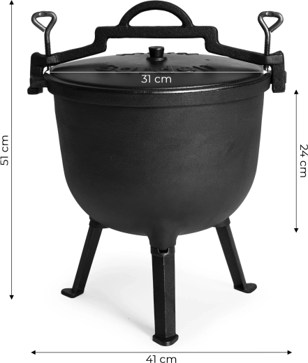 Robustný liatinový kotlík s objemom 15 l je ideálny na varenie na otvorenom ohni, záhradné posedenia aj kempovanie. Vďaka liatine skvele akumuluje a rovnomerne rozvádza teplo, hodí sa na pomaly ťahané guláše, polievky aj pečenie. Súčasťou je veko, stojan a praktické ucho na bezpečné prenášanie. Odnímateľné nožičky uľahčia transport a po ich zložení umožnia použitie aj na plynovom sporáku.