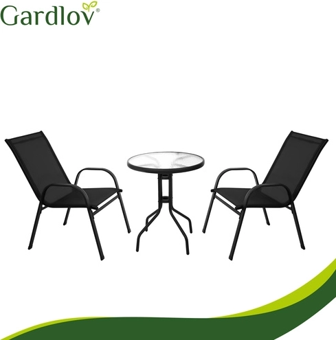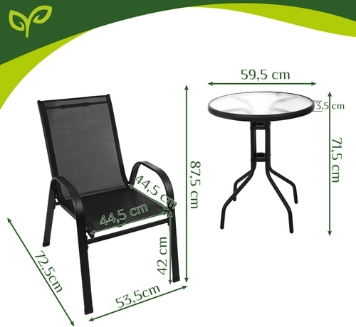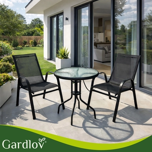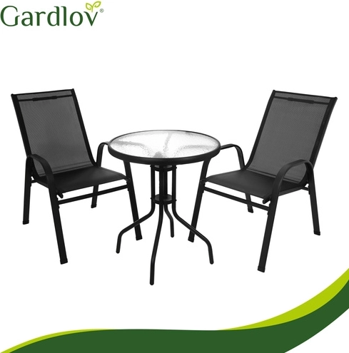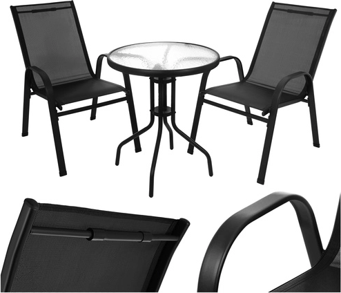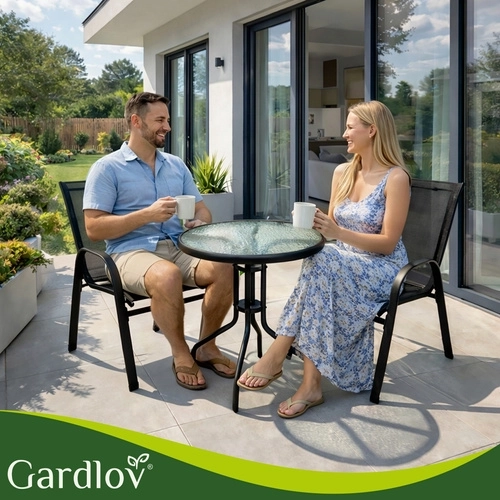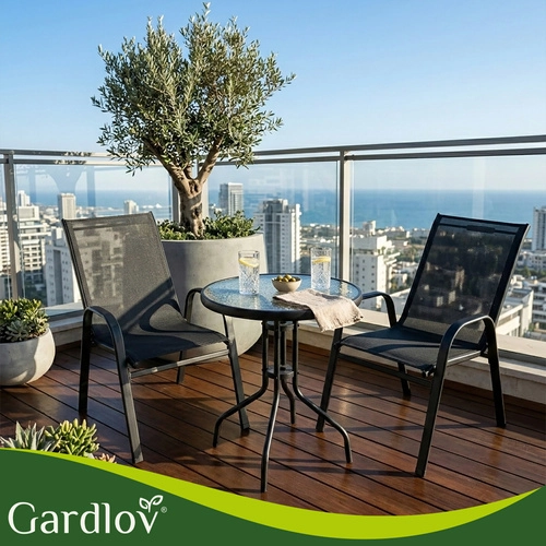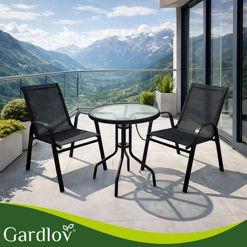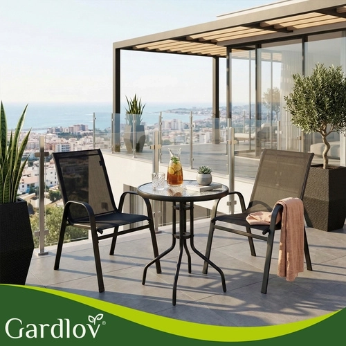 Elegantný balkónový set GARDLOV kombinuje moderný vzhľad a dlhú životnosť. Železný rám s práškovým lakom zabezpečuje stabilitu a ochranu proti korózii, zatiaľ čo priedušné sedáky sa príjemne prispôsobia telu. Textúrovaná doska z 5 mm tvrdeného skla dodáva stolíku bezpečie aj štýl.