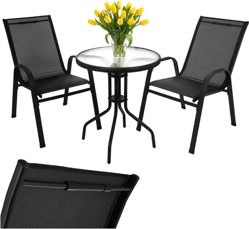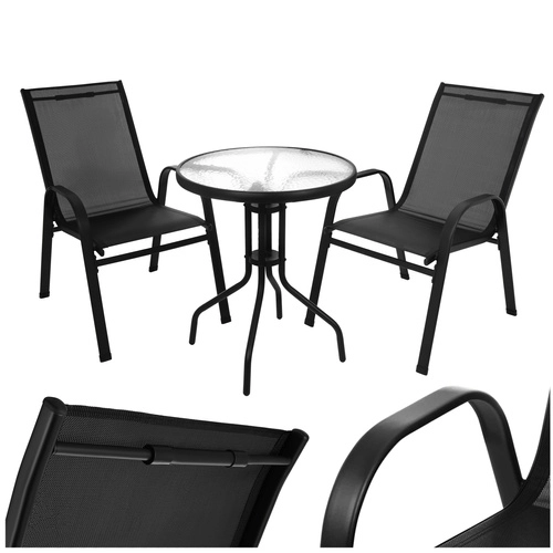 Vytvorte si útulné miesto pre dvoch na balkóne, terase aj v záhrade. Tento praktický 3-dielny bistro set s okrúhlym stolíkom z tvrdeného skla a dvomi vzdušnými stoličkami ponúka stabilnú kovovú konštrukciu s práškovým lakom, je vodoodolný, odolný voči UV žiareniu a ľahko sa udržiava. Ideálny na rannú kávu, popoludňajší relax aj večerné posedenie.