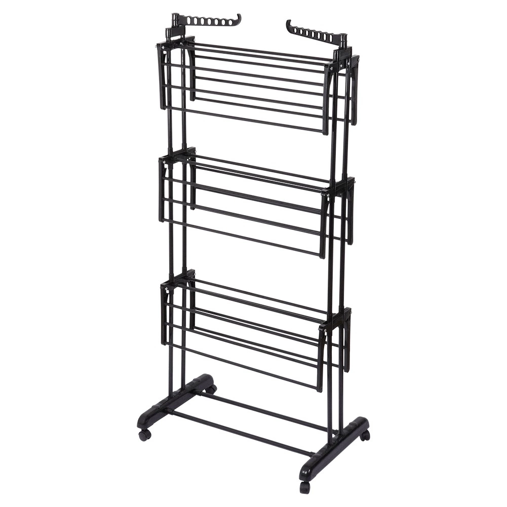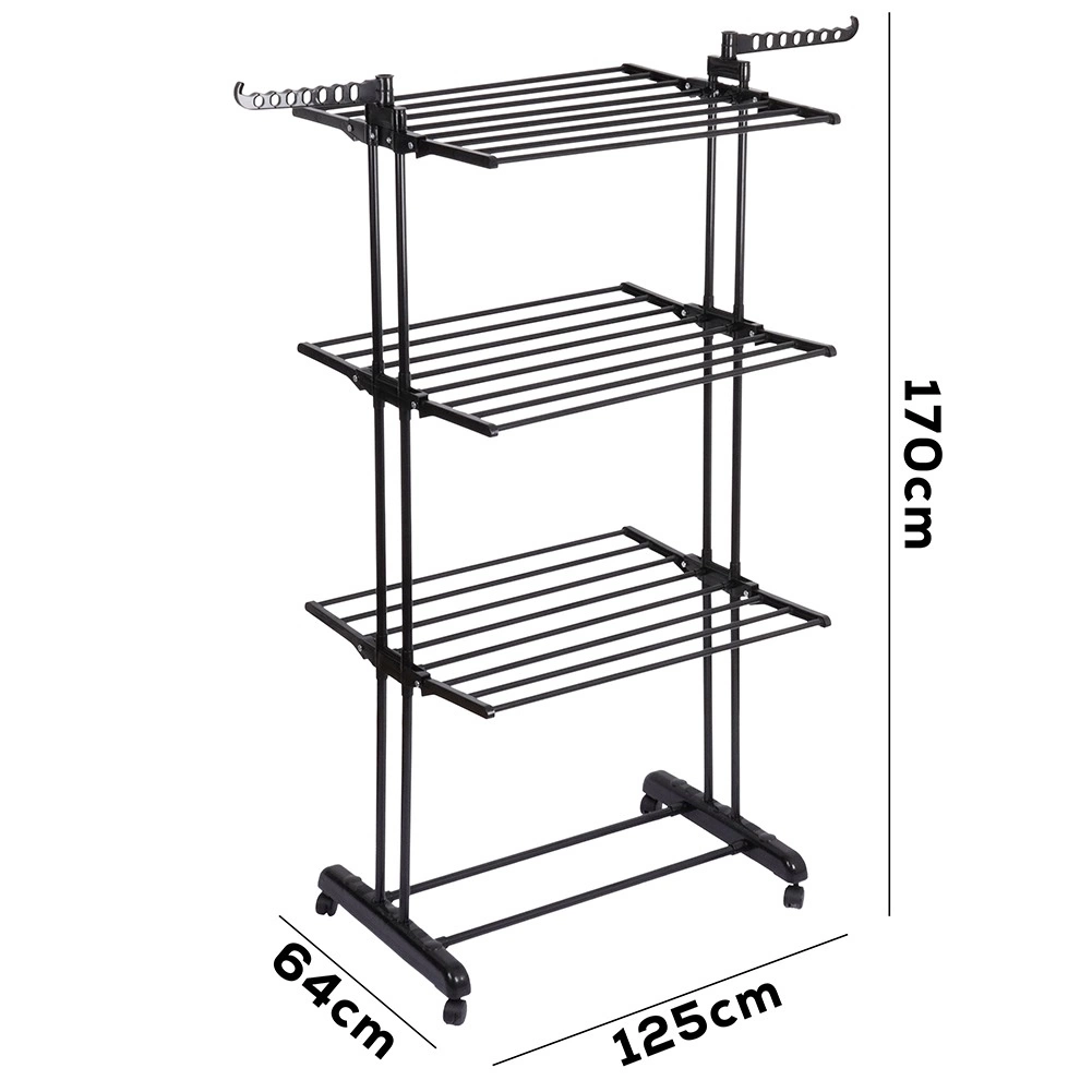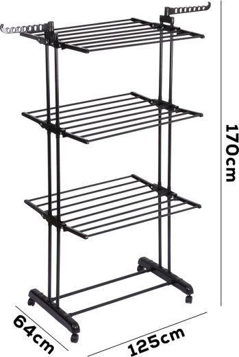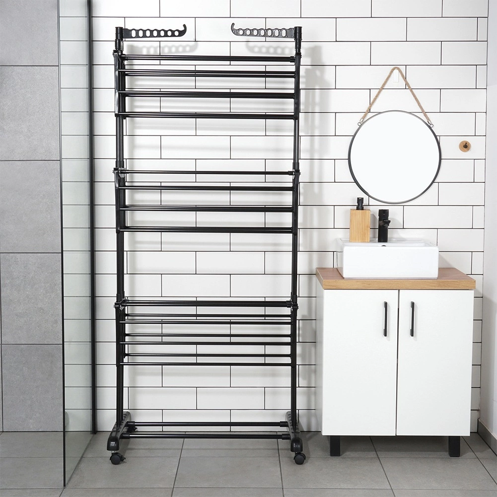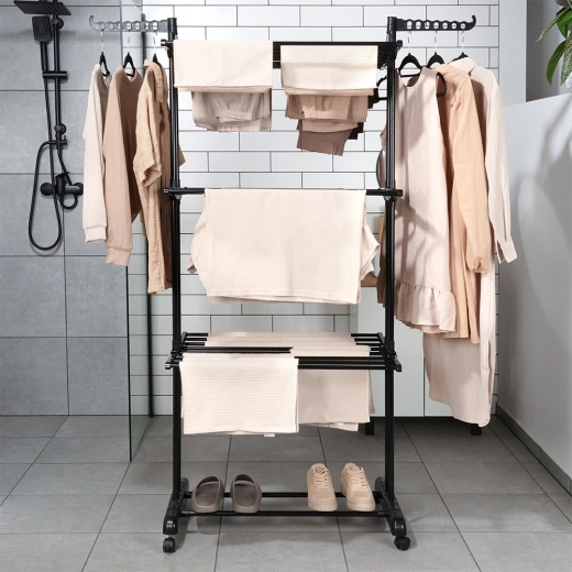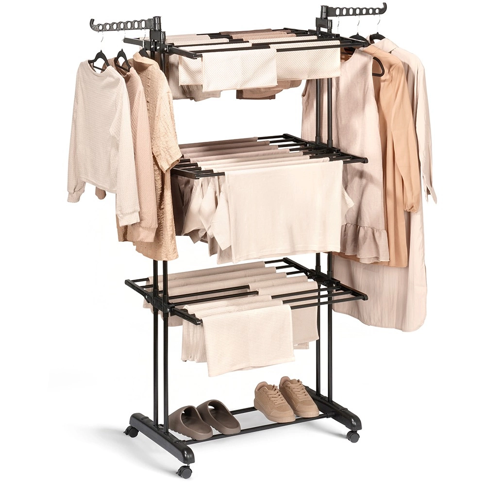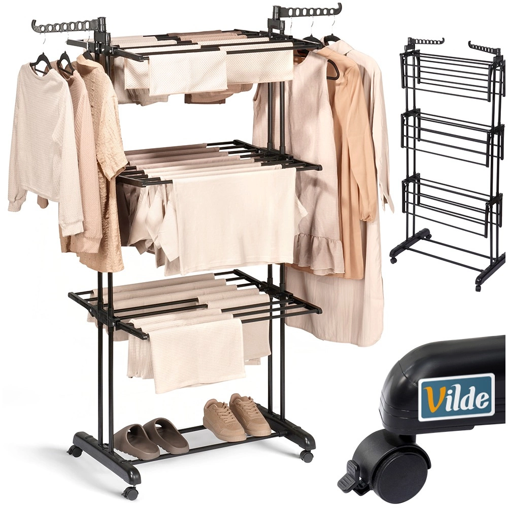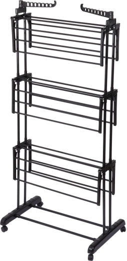 Praktický trojstupňový sušiak na bielizeň s robustnou kovovou konštrukciou v čiernej farbe ponúka až 24 m sušiacej plochy, nosnosť 25 kg a pohodlné kolieska s brzdou. Vďaka vertikálnemu prevedeniu šetrí miesto, má skladacie krídla, bočné ramená na vešiaky (14 miest) a dolnú policu na obuv – ideálny do bytu, na balkón aj terasu.