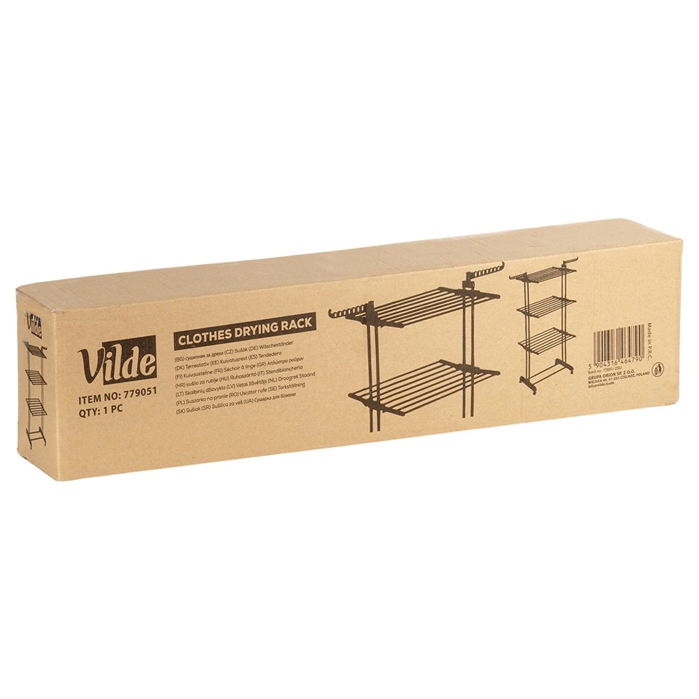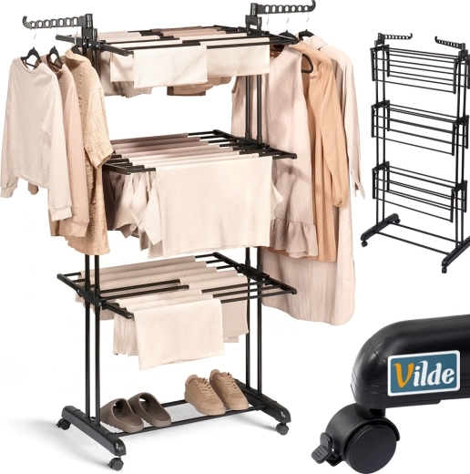 Maximalizujte priestor pri sušení bielizne s vertikálnym sušiakom VILDE. Tri úrovne, šesť nezávisle sklopných krídel a dve ramená na vešiaky umožnia prispôsobiť sušenie malým aj veľkým dávkam bielizne. Stabilná kovová konštrukcia s práškovou farbou vyniká odolnosťou proti vlhkosti a dlhou životnosťou.