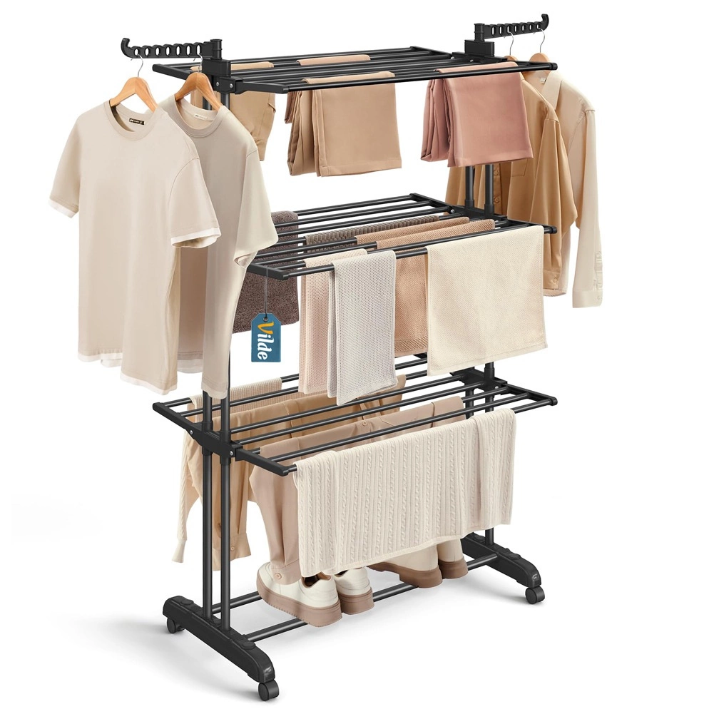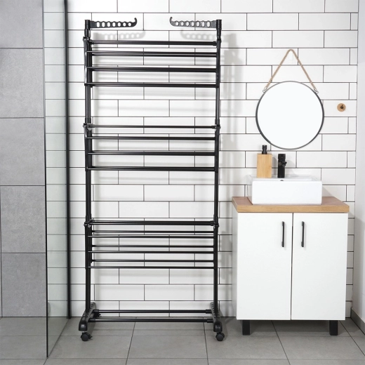 Bočné ramená ponúkajú 14 pozícií pre vešiaky a spodná polica je ideálna na sušenie obuvi či drobných textílií.